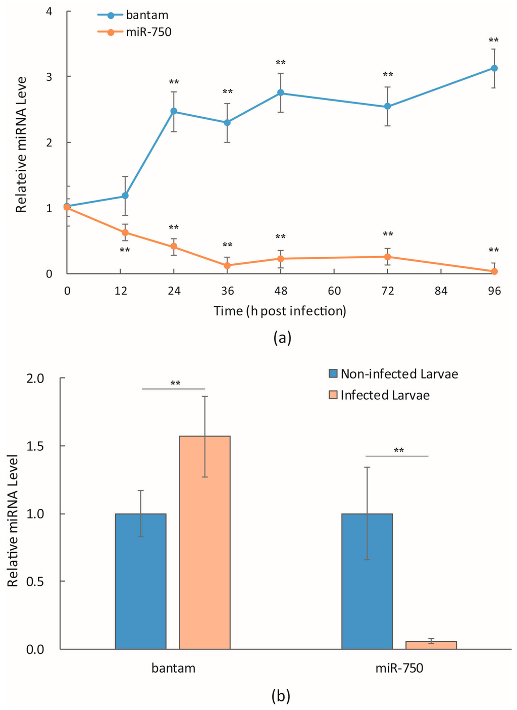Mehrabadi et al. [] and our own unpublished data on microRNAome of Sf9 cells showed that bantam was one of the most abundant microRNAs, which accounted for more than 5% of total microRNA. Our sequence data also suggested that the level of bantam increased late in AcMNPV infection. This was confirmed with real-time quantitative PCR in infected Sf9 cells and S. litura larvae (Figure 1). Unlike most microRNAs that decreased in the expression level after infection, as represented by miR-750 in Figure 1, the level of bantam increased to about 2.5-fold of uninfected cells 24 h p.i., and remained at a high level late in the infection (Figure 1a). The level of bantam was also about 1.5-fold higher than the control in AcMNPV-infected S. litura larvae (Figure 1b).