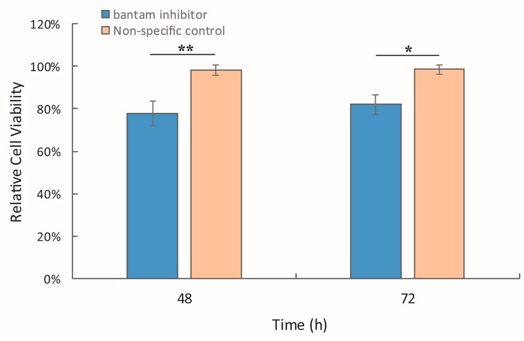 The effect of bantam inhibitor on Sf9 cells. Sf9 cells were transfected with bantam inhibitor (200 nM), and cell viability was determined 48 h and 72 h post treatment. The cell viability in blank control was set as 100%. The means of three replicates was shown, with the error bars indicating the standard deviation. The significance of difference between bantam inhibitor and non-specific treatment was also shown (*: p < 0.05; **: p < 0.01).