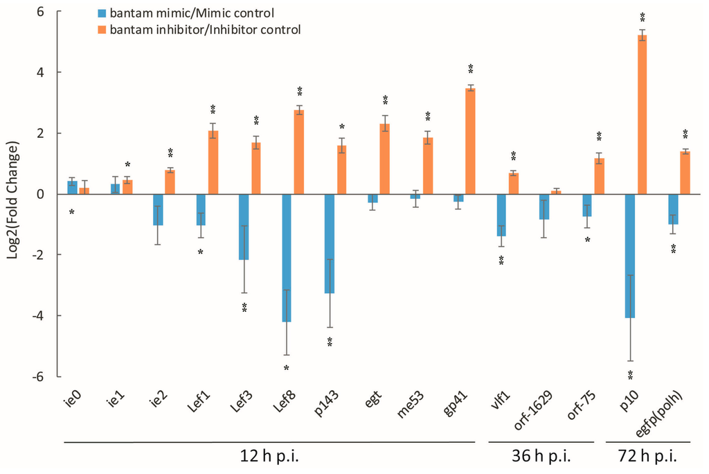 AcEGFP, a recombinant AcMNPV with egfp gene in the polyhedrin locus, was used to infect Sf9 cells in the presence of bantam mimic or inhibitor, and the expression of a series of virus genes was determined with real-time RT-PCR. These genes included virus immediate early and delayed early genes ie0, ie1, ie2, egt, p143, me53, lef1, lef3, lef8, and vlf1, late genes gp41, orf1629 and orf75, and very late genes p10, polh (represented by egfp). Different time points were used for genes of different categories, which were 12 h, 36 h and 72 h p.i. for immediate early and delayed early, late, and very late genes, respectively. The results showed that bantam mimic and inhibitor significantly affected the transcription of many of the tested genes (Figure 3). In most cases, the expression level was higher than the control in the presence of bantam inhibitor (the logarithm of fold change was positive), and lower than the control in the presence of bantam mimic (the logarithm of fold change was negative). Among all genes, the three most affected genes were lef8, gp41 and p10, the expression level of which increased by about 8, 10 and 40 times, respectively, in the presence of bantam inhibitor. The expression of immediate early genes ie0 and ie1 remained stable in the presence of either bantam mimic or inhibitor.
