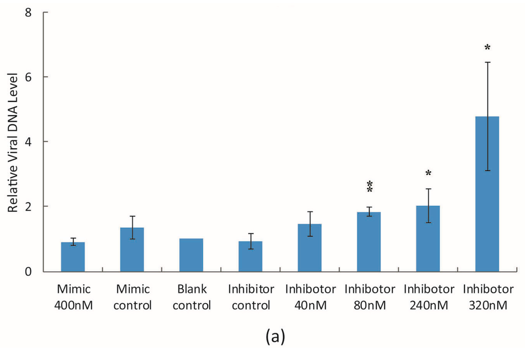 MicroRNA is a kind of highly conserved endogenous small RNA that regulates gene expression at the post-transcriptional stage. They have major roles in cell proliferation, apoptosis, development, metabolism, and many other biological processes in almost all eukaryotic organisms []. MicroRNA is also known to play important roles in virus–host cell interactions [,]. Changes in cellular microRNA pattern in virus-infected cells have been reported for different viruses [,,]. Some host cell microRNAs interfere with virus infection [,,], while some others are exploited by viruses to facilitate their own replication []. Viruses may also encode their own microRNA to interfere with host defense mechanism, or to regulate cellular and virus gene expression [,,].
