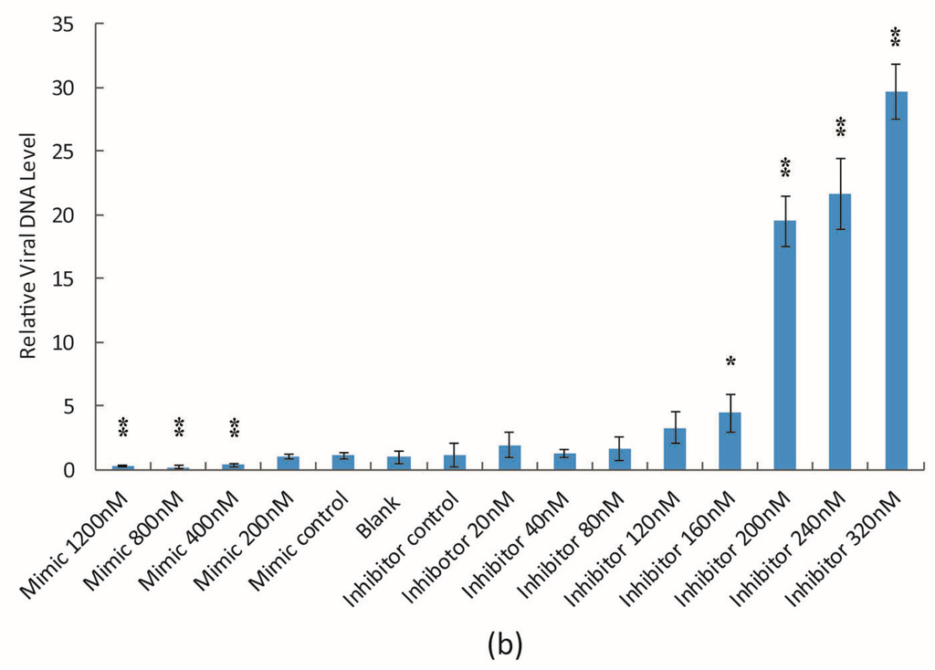 The viral DNA level in infected cells was also determined 48 h p.i. when cells were infected at MOI of 2 pfu/cell, or 72 h p.i. when the cells were infected at MOI of 0.05 pfu/cell, in the presence of different concentrations of bantam mimic and inhibitor. A dose-dependent effect was observed in both cases (Figure 4). The more bantam inhibitor that was added, the higher the level of virus genome that was detected; the more bantam mimic that was added, the lower the level of virus genome that was detected. The effect was more significant at a low MOI. However, bantam mimic or inhibitor had no major effect on the titer of budded virus in the medium 48 h p.i. and 72 h p.i..
