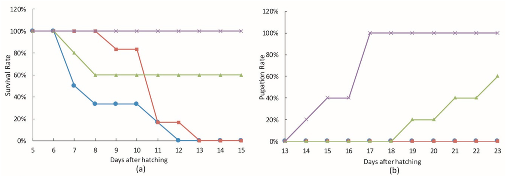 Lavae of S. litura and S. exigua were reared individually in polymer cups on artificial diet (Keyun Biocontrol, Jiyuan, China), under the condition of 28 °C, 70%–90% humidity, and photoperiod of 15:9. Larvae of the same hatching time were used for experiments.