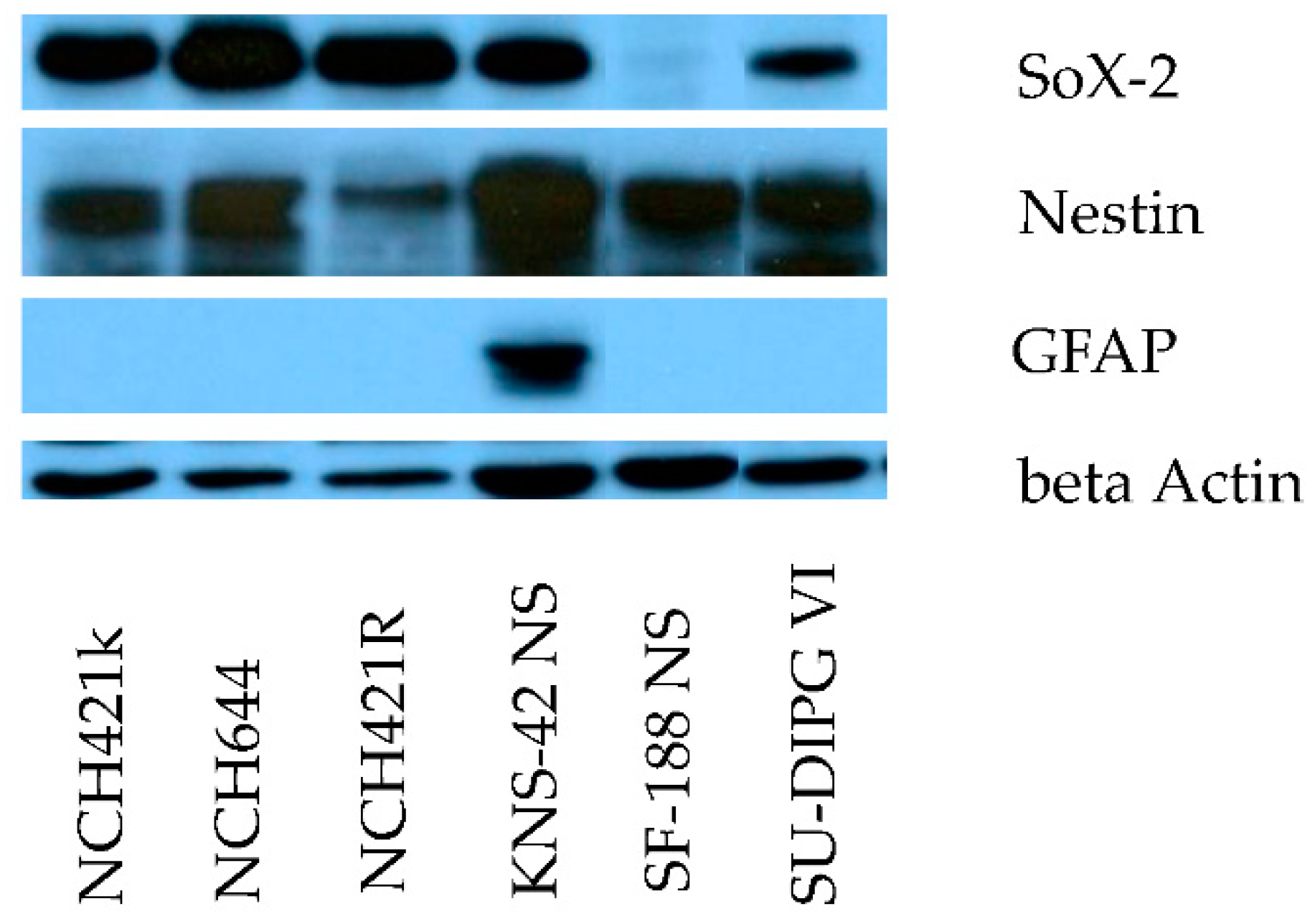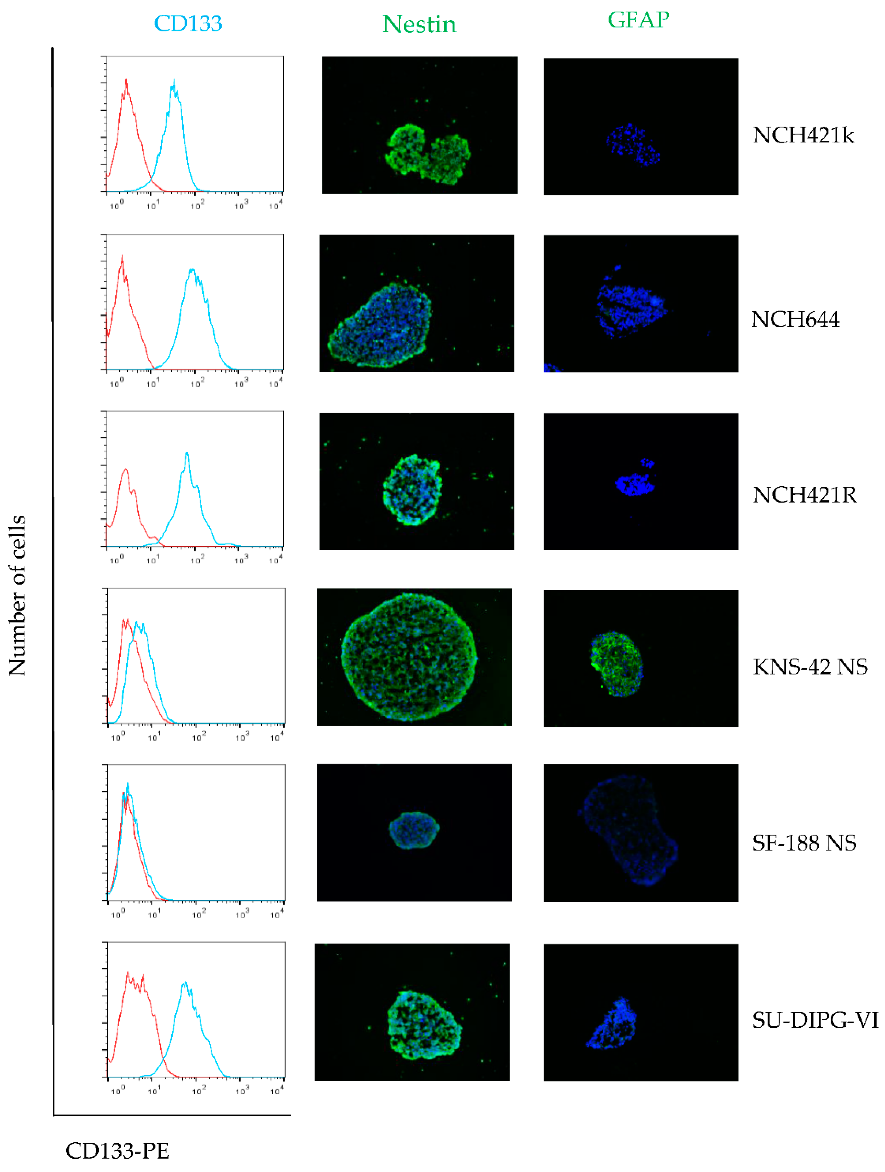 The pediatric glioblastoma cell lines SF-188 and KNS-42 were obtained from the Department of Neurosurgery, University of California (San Francisco, CA, USA) and the Japan Health Science Research Resources Bank, (Osaka, Japan), respectively. The SF-188 NS and KNS-42 NS neurosphere subclones were generated by cultivating the parental lines under serum-free conditions as described above (“secondary neurospheres”). The neurosphere cultures SU-DIPG-IV, and SU-DIPG-VI, have been established from post mortem diffuse intrinsic pontine samples of two pediatric patients, and have been previously characterized [25,26]. These cultures were a kind gift of Michelle Monje-Deisseroth, University of Stanford (Stanford, CA, USA). The human glioma stem-like cell cultures NCH421k and NCH644 were derived from biopsies taken from adult glioblastoma patients and have been established the laboratory of Christel Herold-Mende. These cells had been previously reported to represent glioma “stem-like” cells [27].