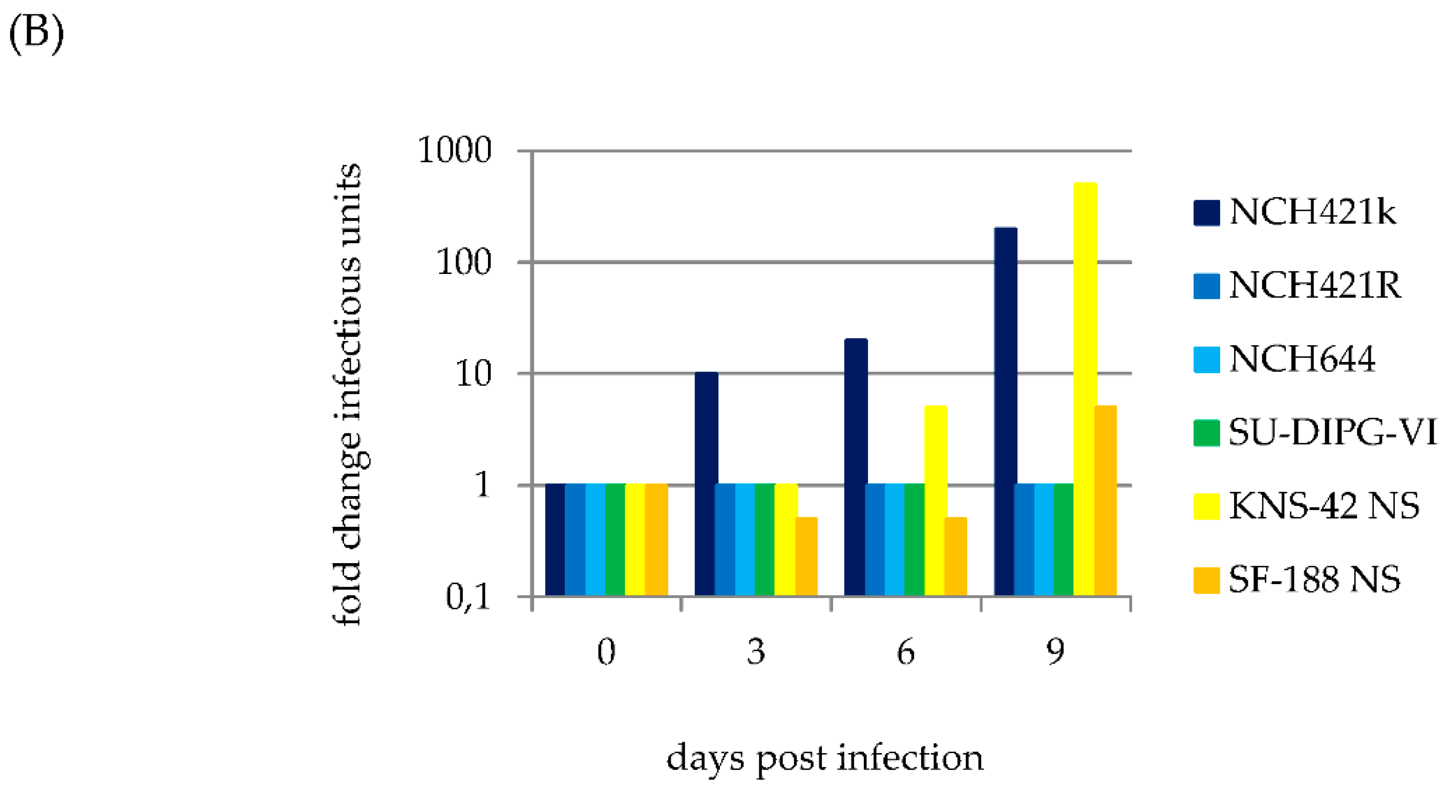 In order to determine whether H-1PV infection of HGG neurosphere cells leads to the production of infectious progeny virions, cultures were infected at an MOI of one PFU per cell and cell culture supernatants were collected at intervals indicated.NCH421R cells, which are unable to express viral proteins upon H-1PV infection (Figure 3A) were used as negative controls and failed to produce infectious viral particles as expected (Figure 3B). Similarly, infection of NCH 644 and SU-DIPG VI neurospheres was non-productive, in spite of the competence of these cells for viral transduction. In contrast, two pediatric (KNS-42 NS, SF-188 NS) and one adult (NCH421k) HGG neurosphere cultures sustained a significant increase in infectious virus titers, demonstrating permissiveness of these cells for progeny virus production. In the cell culture supernatants titers increased from 1,000 IU per mL to 5,000 IU per mL in SF-188 NS, from 5,000 IU per mL to 1,000,000 IU per ml in KNS-42 NS and from 50,000 IU per mL to 10,000,000 IU per mL in NCH421k within nine days after infection with H-1PV at MOI 1 (Figure 3B). The increase in titers of infectious particles ranged from 5-fold in SF-188 NS to 200-fold in KNS-42 NS and NCH421k clearly indicates successful virus replication, assembly and release of progeny virions in these neurosphere cultures.