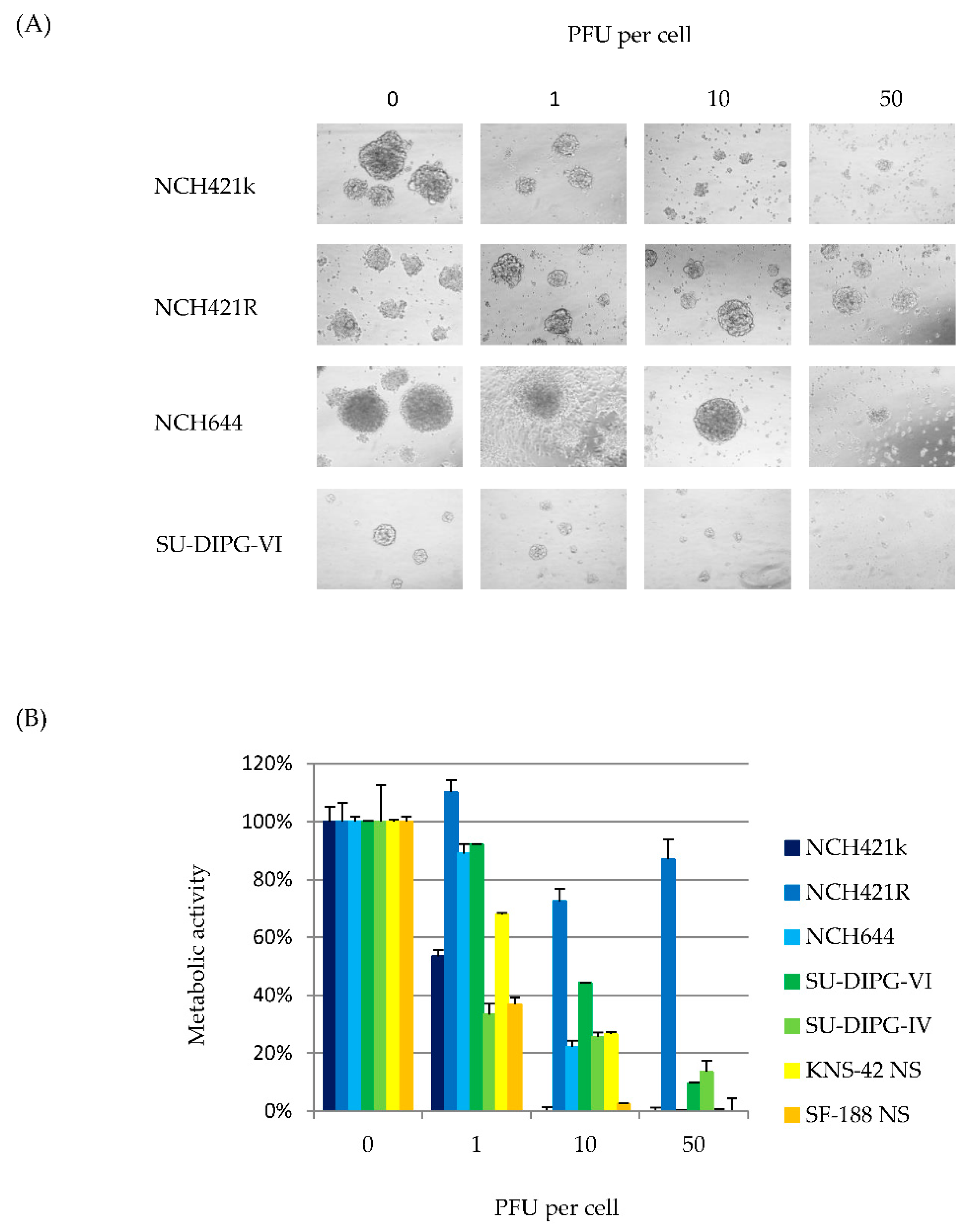 In parallel, H-1PV-induced changes in cell viability were determined by WST-1 assay. Nine days after infection, a striking dose-dependent decrease of metabolic activity was observed in all six permissive HGG neurosphere cultures (Figure 4B). The 50% inhibition (LD50) doses of input virus ranged from one (SU-DIPG-IV, SF-188 NS) to ten (SU-DIPG-VI, KNS-42 NS, NCH421k and NCH644) PFU per cell. Thus, virus-induced cytotoxicity did not significantly differ between pediatric and adult HGG neurosphere cultures. In non-permissive NCH421R cultures, neurosphere size and cell viability remained unaltered after infection with H-1PV at an MOI of up to 50 PFU/cell which led to the complete eradication of susceptible neurosphere cultures. The NCH421R derived subclone therefore represents a model to study H-1PV resistance in HGG neurospheres, as characterized below in further detail.