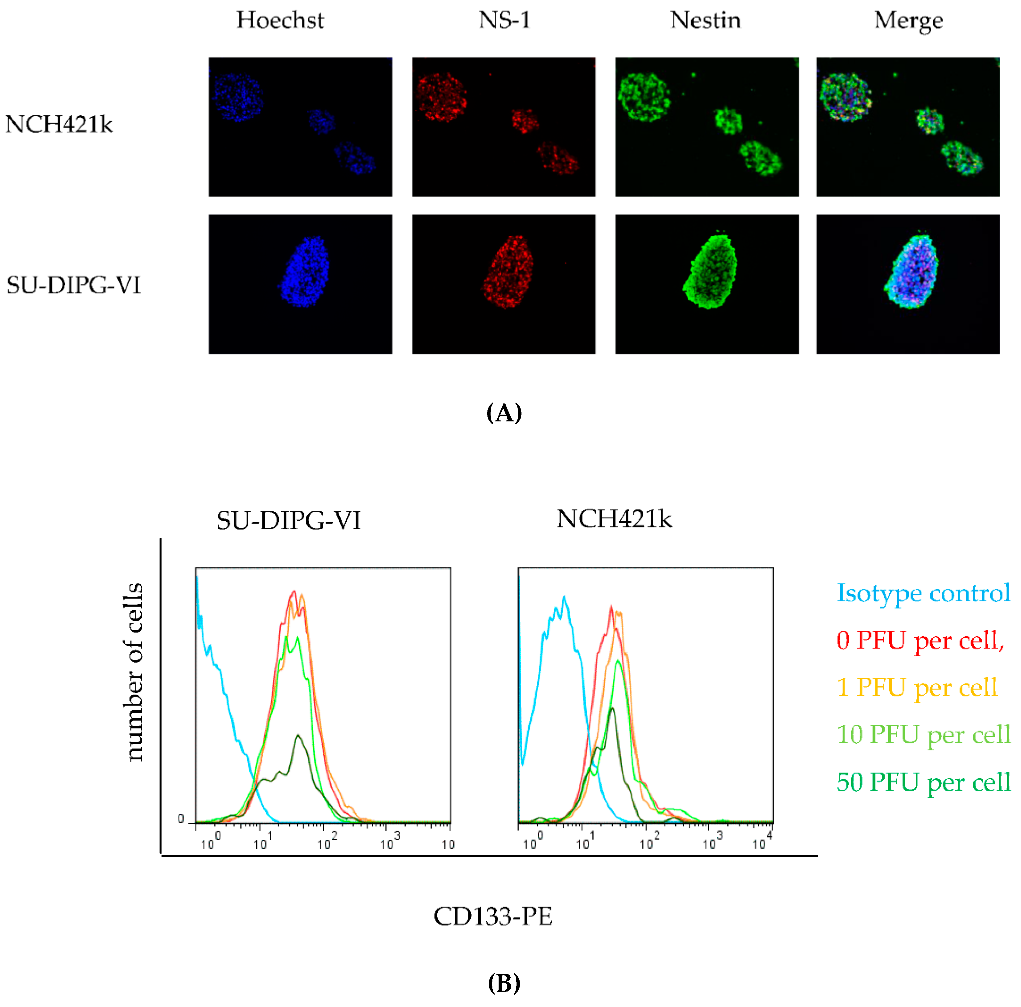 In order to determine whether H-1PV preferentially killed the stem cell fraction or the differentiating cell subpopulation of neurosphere cultures, the pediatric SU-DIPG-VI and the adult NCH421k neurosphere cultures were analyzed for the expression of stem cell markers after H-1PV infection or mock treatment. For this purpose, cells were incubated with increasing doses of H-1PV at day 6 after establishment of neurospheres. Three days after infection immunofluorescence experiments were performed to detect the viral cytotoxic protein NS-1 (red) and the neuroepithelial stem cell marker protein Nestin (green). Co-staining for both proteins revealed the nuclear accumulation of NS1 in cells showing strong Nestin-positivity and confirmed that H-1PV was indeed able to target stem cells within these neurospheres (Figure 5A). In parallel, the proportion of surviving cells was quantified by 7AAD staining and quantification of living cells (not stained) by flow cytometry. The absolute number of surviving cells decreased with the infectious dose of H-1PV initially administered. In both neurosphere cultures, a similar dose-dependent drop in the survival of CD133+ cells was observed (Figure 5B), showing that the CD133+ and CD133- fraction is target for H-1PV cytotoxic effects. Results were expressed as percentages of living CD133+ cells in virus-infected cultures relative to their mock-infected counterparts (Figure 5C).