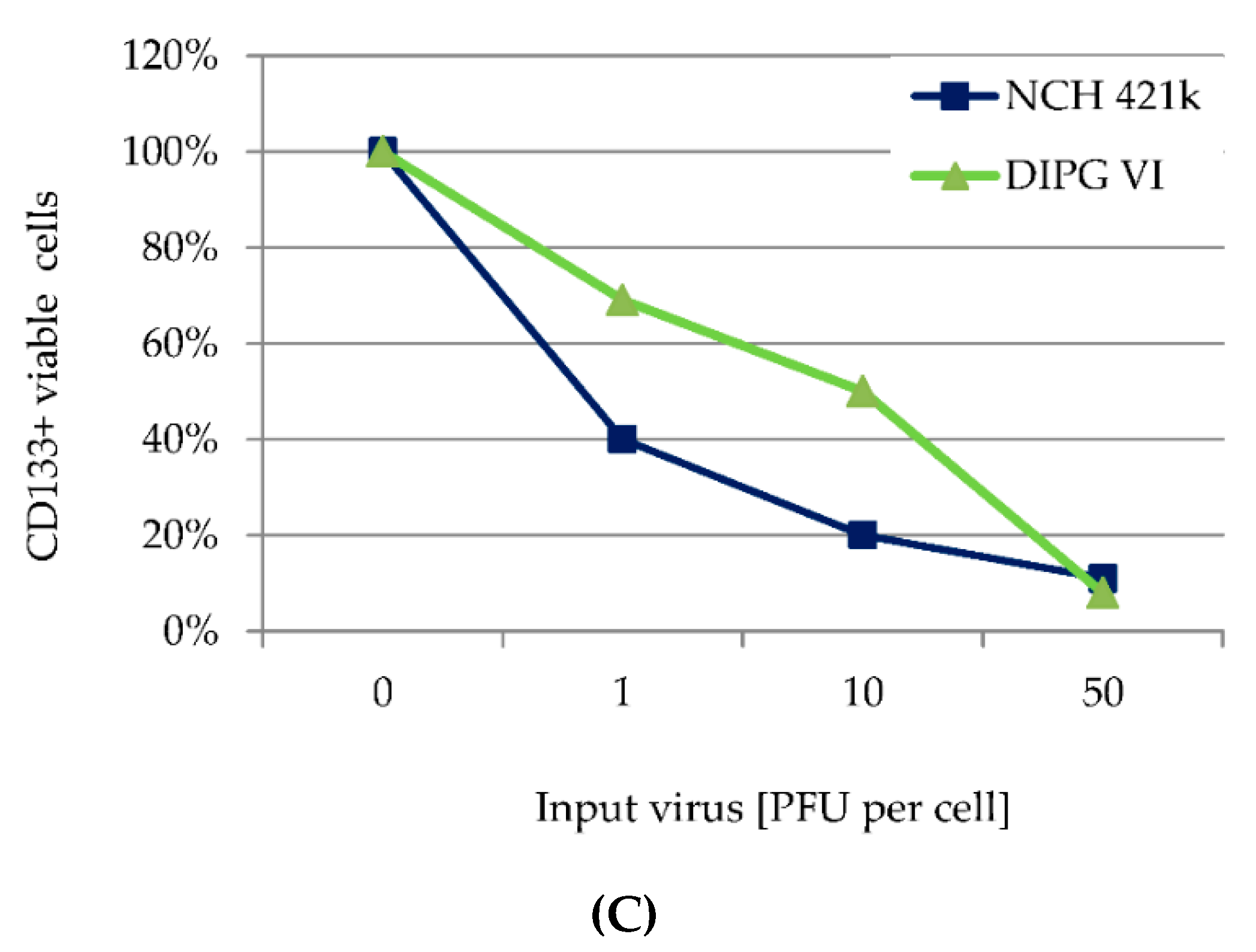 In some adult and pediatric GBM neurosphere cultures, infection went to completion, leading to the production and release of infectious progeny virions (Figure 3B). These data indicate that, at least to some extent, H-1PV replication takes place in HGG stem cells, and that virus multiplication and spread throughout the tumor may occur in patients. The cellular factors restricting the ability of some HGG cells to support a productive H-1PV infection remain to be identified [47]. It is noteworthy that irrespective of their capacity for sustaining a productive infection, all HGG neurosphere cultures tested were sensitive to the cell-killing effect of H-1PV in a dose-dependent fashion (Figure 4). The sensitivity of HGG stem-like cells to H-1PV toxic activity was independent of the tumor molecular make-up and the patient age or risk profile. The LD50 determined for the adult glioma stem-like cells was in the range of the effective doses previously determined for adherent adult GBM cell lines [48,49]. Interestingly, H-1PV exerted significant cytotoxic effects on both DIPG and GBM neurosphere culture models of pediatric origin at comparably low multiplicities of infection. Co-staining for Nestin and the viral protein NS1 showed that expression of stem cell markers was maintained in HGG cells undergoing viral transduction arguing against a neural differentiation-inducing effect of H-1PV in HGG cells. Accordingly, flow-cytometric analysis of HGG neurosphere cells surviving H-1PV infection showed no enrichment in CD133 negative cells.