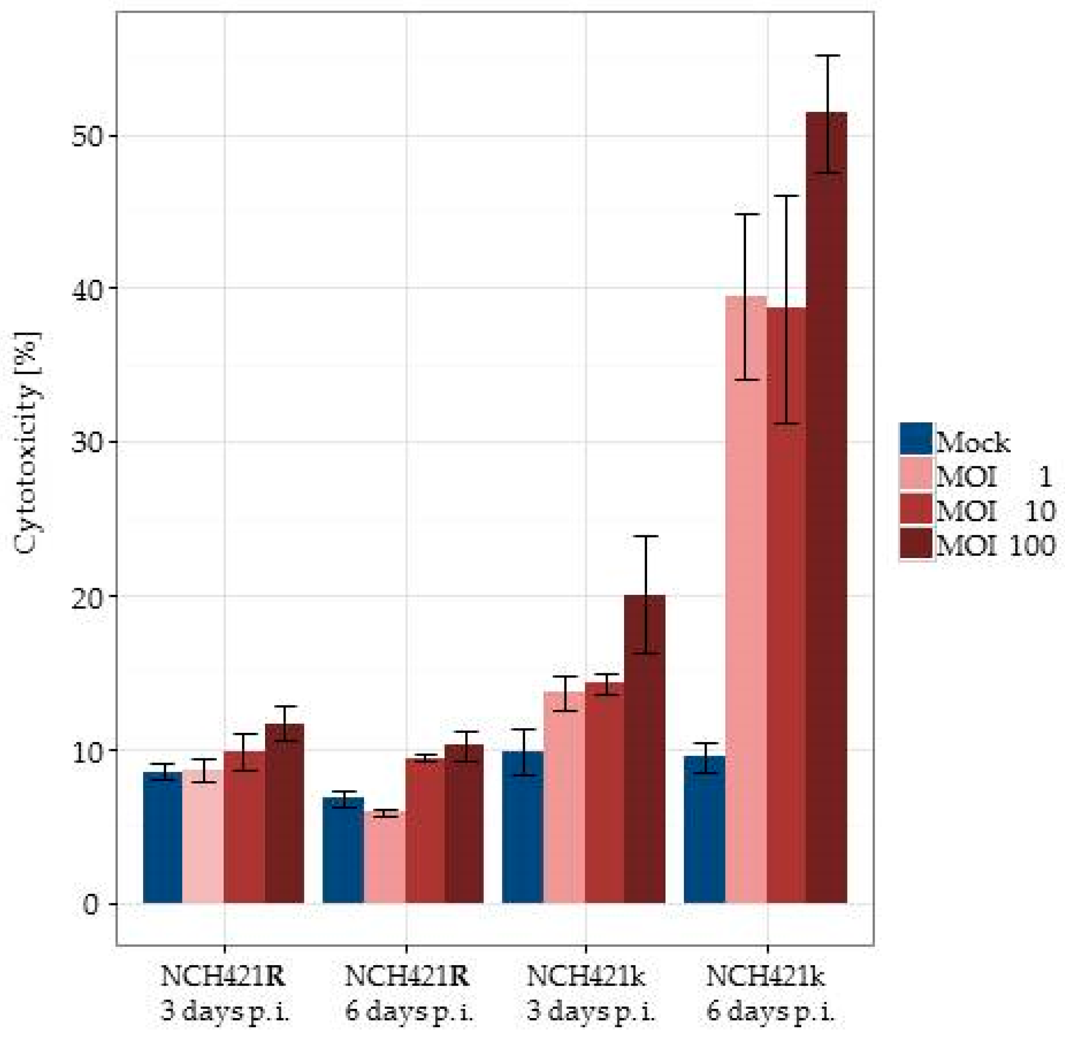 H-1PV infection induces lytic infection of HGG neurospheres in vitro. Lactate dehydrogenase (LDH)-release assays were performed on NCH421k and NCH421R cells at days 3 and 6 after infection with H-1PV at increasing MOIs. Specific lysis is given in relation to completely lysed cells by detergent treatment. Means from six replicates and respective standard errors are displayed.