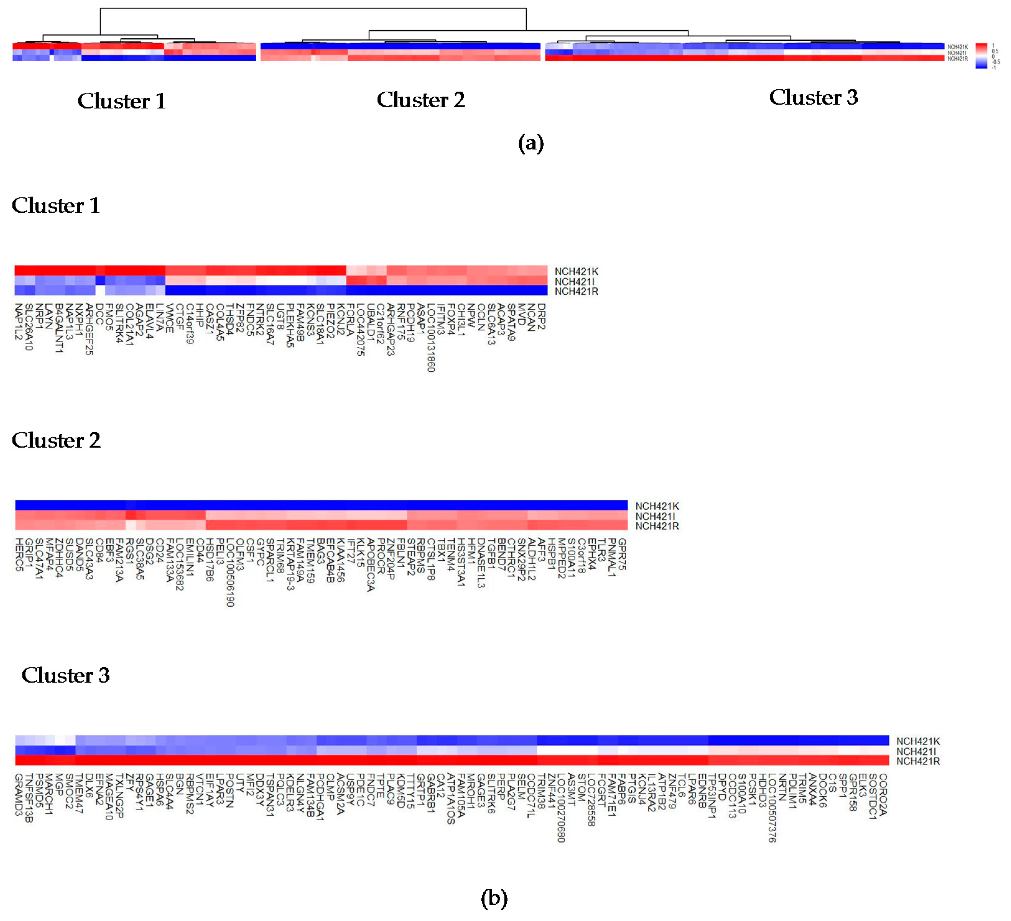 Comparative transcriptome analysis of the NCH421k and its partially and fully H-1PV resistant subclones NCH421I and NCH421R. (a) Unsupervised clustering of the 201 genes most differentially expressed between NCH421k, NCH421I and the resistant subclone NCH421R. Quantitative comparison of the three profiles reveals genes that are up (red) or down (blue) regulated in resistant NCH421R cells in comparison with NCH421I and NCH421k cells showing high susceptibility to H-1PV infection; (b) Each of the three main clusters is shown independently in order to allow a more detailed analysis.