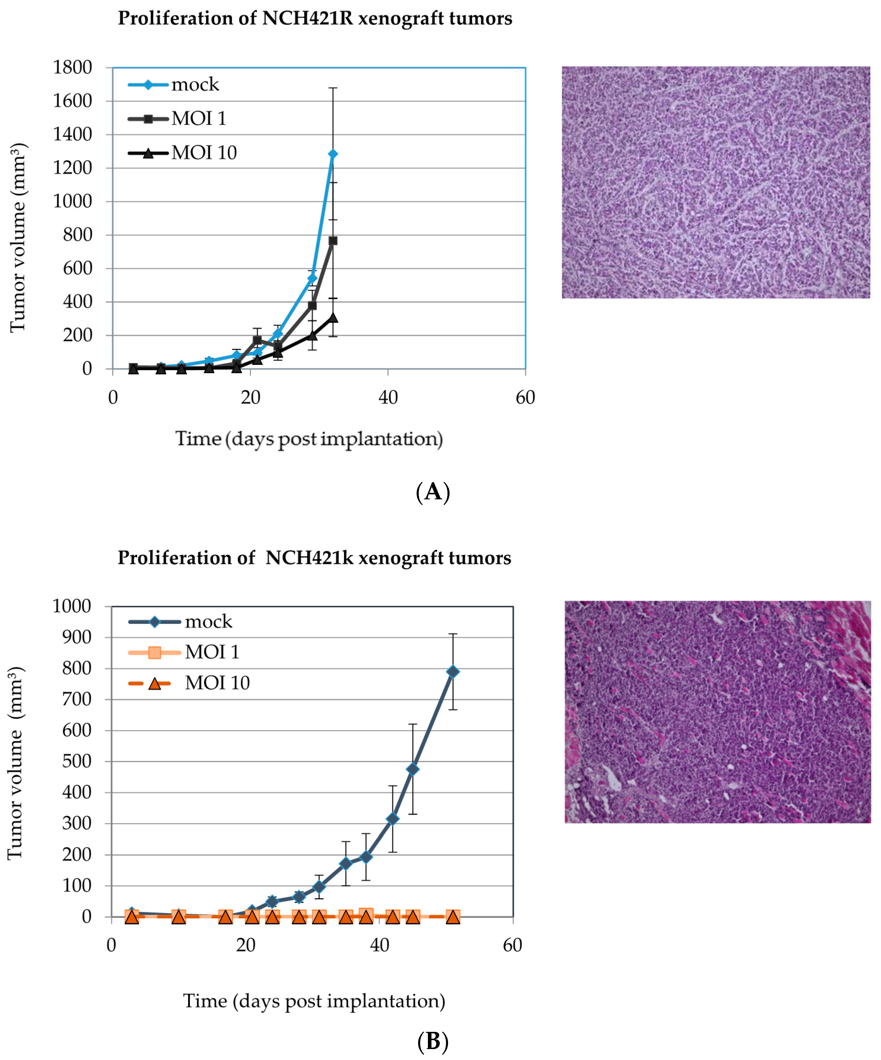 Four hours after infection the mock-treated or H-1PV infected cells were implanted into NOD/SCID mice by subcutaneous injection. Implantation of mock-treated NCH421R cells in the NOD/SCID xeno-transplantation model led to the formation of exponentially growing tumors (see Figure 8A) that were undistinguishable from NCH421k tumors with respect to histomorphological patterns (Figure 8B).