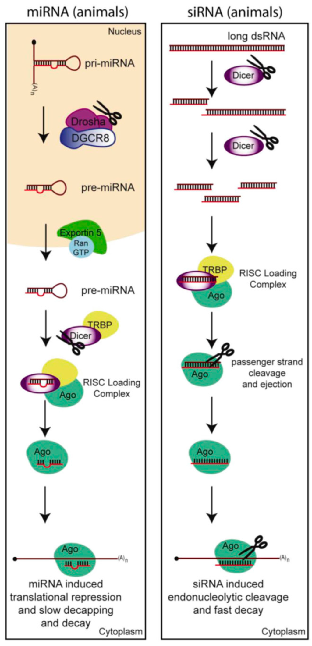 - Ameres, S.L.; Horwich, M.D.; Hung, J.H.; Xu, J.; Ghildiyal, M.; Weng, Z.; Zamore, P.D. Target RNA-directed trimming and tailing of small silencing RNAs. Science 2010, 328, 1534–1539. [Google Scholar] [CrossRef] [PubMed]