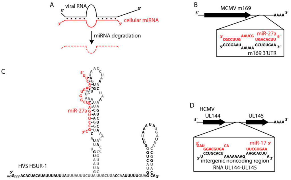 - Buck, A.H.; Perot, J.; Chisholm, M.A.; Kumar, D.S.; Tuddenham, L.; Cognat, V.; Marcinowski, L.; Dolken, L.; Pfeffer, S. Post-transcriptional regulation of MIR-27 in murine cytomegalovirus infection. RNA 2010, 16, 307–315. [Google Scholar] [CrossRef] [PubMed]