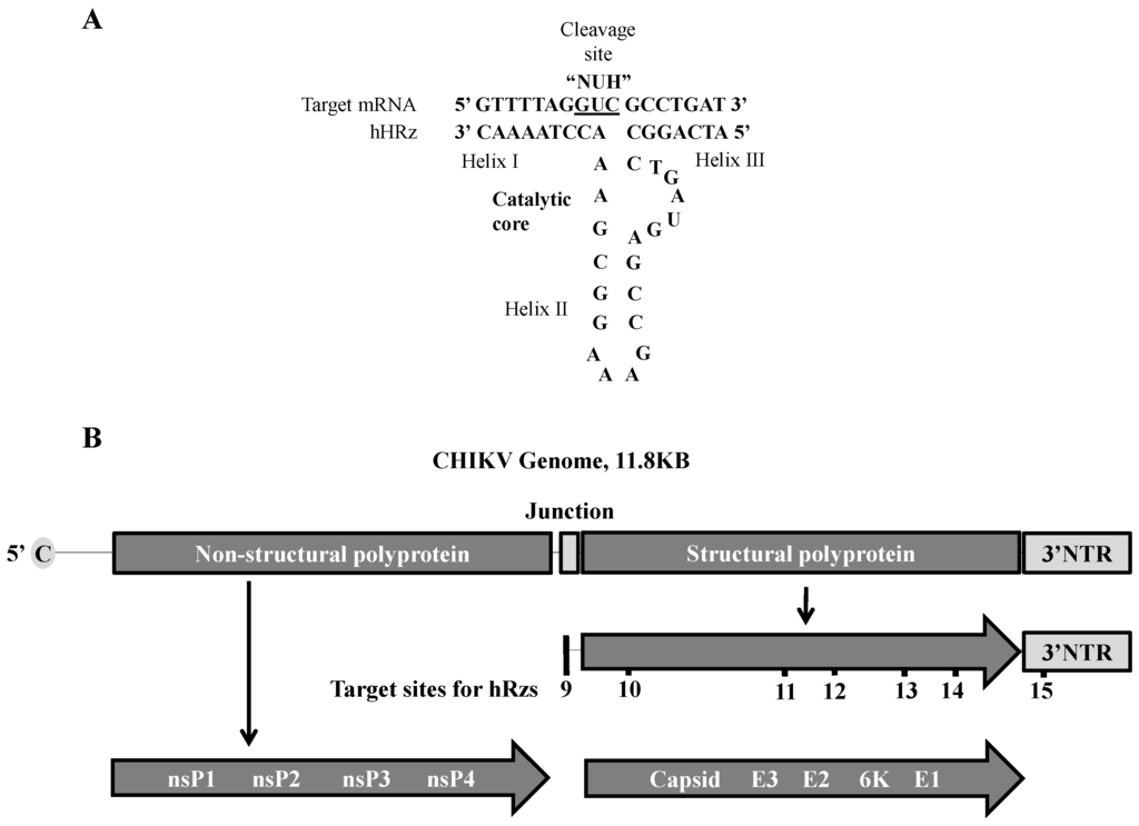 2.1. Selection of hRz Target Sites in the CHIKV Genome