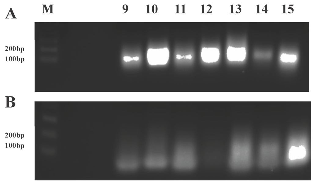 Real-time polymerase chain reaction (RT-PCR) analysis of transformed Vero cells. The presence of a 130 bp fragment (t-RNAval promoter + ribozyme) for each ribozyme (A) demonstrates stable transformation of the clonal cells. The absence of this 130 bp fragment in the RT-negative control (B) indicates a lack of genomic DNA contamination in the isolated RNA. The low molecular weight smears apparent in each lane are attributed to primer dimers as they are well below the lowest size standard in the gel. The forward primer used was specific to the common t-RNAval promoter, and the reverse primer was specific for each ribozyme. M = 1 kb plus DNA ladder, lanes 9–15 correspond to hRzs #9 through #15.