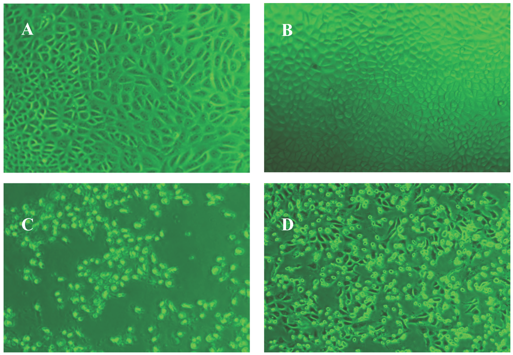 Comparative characteristic cytopathic effect (CPE) of wild types (day 3) and clonal populations (day 7). Images were taken at 40× magnification. (A) hRz #9 and (B) hRz #14 expressing cells with no CPE where (C) and (D) are untransformed Vero cells showing severe CPE.