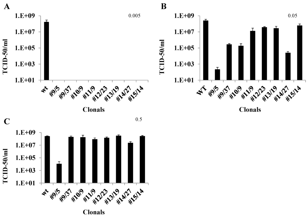 For cell culture transformations we cloned each hRz construct into a transformation vector, pLAeRz #ARH, containing an RSV-promoted hygromycin gene [25]. Transfected Vero cells selected with 200 µg/mL hygromycin yielded enriched populations of transformed cells which were then sorted to establish clonal populations of all seven hRzs. Infection of these clonals with greater MOIs of 0.05 and 0.5 demonstrated that hRz #9/5 was the most effective clone, exhibiting 5.5–6 orders of magnitude greater suppression, followed by clones #14/27 and #10/2 (Figure 4). The observed variation among clonal populations expressing a given hRz suppressor gene is not uncommon [47,48] and is likely attributable to position effects on transgene expression. However, considering the number of individual clones analyzed for each hRz, it is more likely that these differences are reflective of the relative effectiveness of each ribozyme against its target site in the virus genome.
