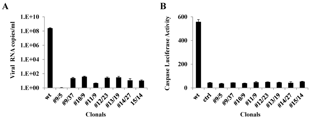 Similarly, qRT-PCR analysis of these same clones displayed negligible amplification of the CHIKV genome sequences compared with the untransformed wild-type Vero cells (Figure 5A). The small level of amplification detected in some clones may be due to the presence of defective virus particles that may result from effects on packaging of the viral genomes and/or assembly and release of virions due to genomic RNA degradation. In contrast, both the TCID50-IFA and caspase-3 assays quantify the infectious potential of a viral inoculum and therefore do not detect defective particles or genomes.