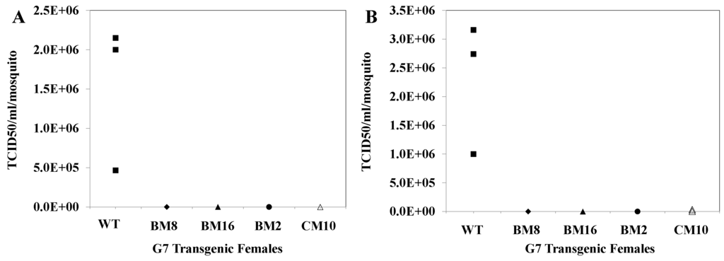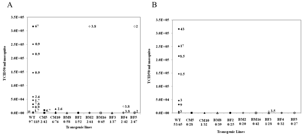 Saliva titers performed on G7 transgenic mosquitoes challenged with CHIKV. Three pools of 15 female mosquitoes were collected at seven days post blood feeding for each transgenic line and were allowed to probe a feeding solution for 2 h. TCID50-IFA was performed on both the feeding solution (A) and whole body homogenates (B) of the mosquito pools. None of the transgenic lines tested exhibited significant viral titers compared with the control (WT).