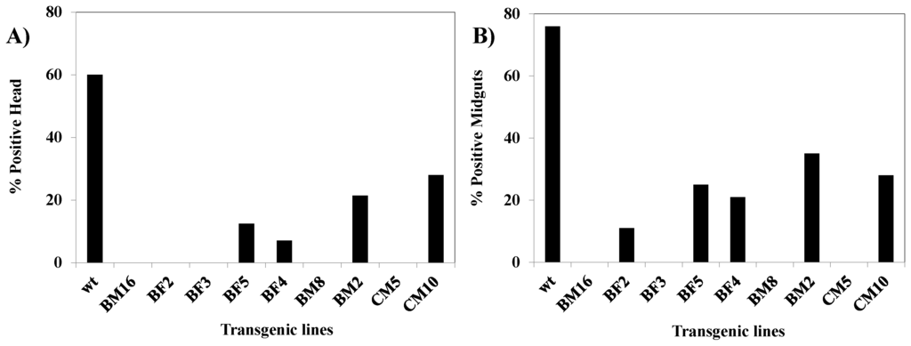 In a separate analysis, we infected multiple females from each transgenic line as well as the control HWE strain and performed IFA on head squashes and midguts as previously described [37]. Viral infection was absent in most transgenic lines, with only a few individuals exhibiting head fluorescence in the BM2 and CM10 lines. All control HWE individuals exhibited fluorescence (Figure 8). This observation complemented the TCID50-IFA results.