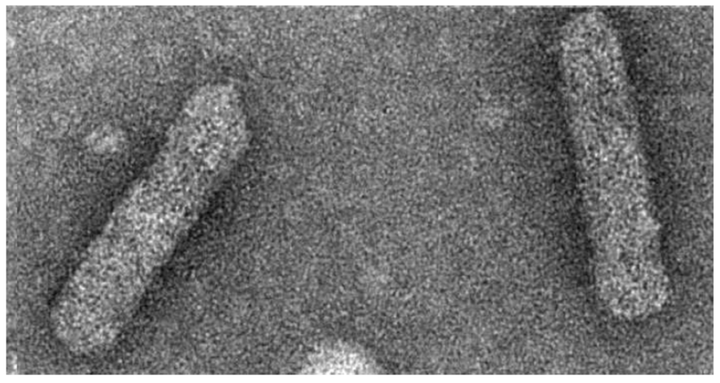 Badnaviruses, the plant pararteroviruses of this review, infect a broad range of economically important crop plants all over the world [9,10,11]. The economic loss caused by the different species in various crops varies between 10% and 90%. The virions of badnaviruses are about 30 nm in diameter and vary in length between 120 and 150 nm, depending on the species (Figure 1) [12]. Virions are found in the cytoplasm and sometimes in vacuoles. The genome consists of a single circular molecule of double-stranded open circular DNA. It includes at least three open reading frames (ORFs) thought to be translated from the more-than-genome length RNA transcript. The complete genome is 7200–9200 bp long. Badnaviruses are also known to be present as integrated sequences in some host plant genomes and then referred to as endogenous badnaviruses [13,14]. The integration is assumed to have taken place by illegitimate recombination into host genomes, and their presence is not necessarily associated with infection. However, in some cases, these copies can give rise to systemic virus infection by recombination events, for instance induced by abiotic stress like in vitro tissue culture process [15,16] and interspecific crosses [17]. The presence of endogenous viruses poses a new challenge for fool-proof diagnosis, taxonomy, safe movement of germplasm, and management of diseases caused by badnaviruses.