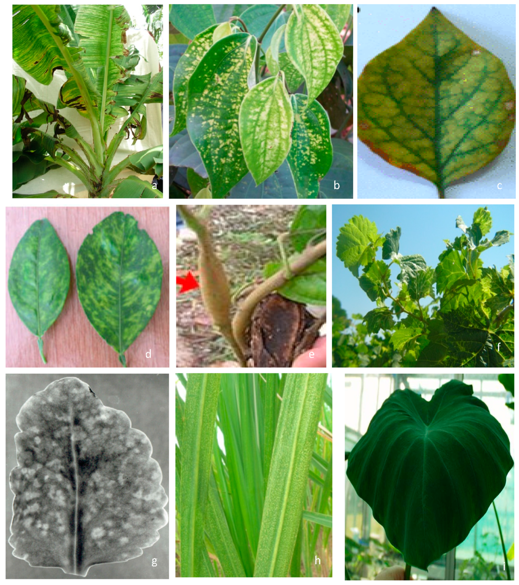 - Selvarajan, R.; Balasubramanian, V.; Sheeba, M.M.; Raj Mohan, R.; Mustaffa, M.M. Virus-indexing technology for production of quality banana planting material: A boon to the tissue-culture industry and banana growers in India. Acta Hortic. 2011, 897, 463–469. [Google Scholar] [CrossRef]