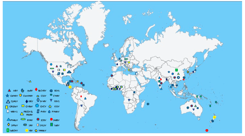 Worldwide distribution of badnaviruses. Details of acronyms used are provided in Supplementary Materials Table S1.