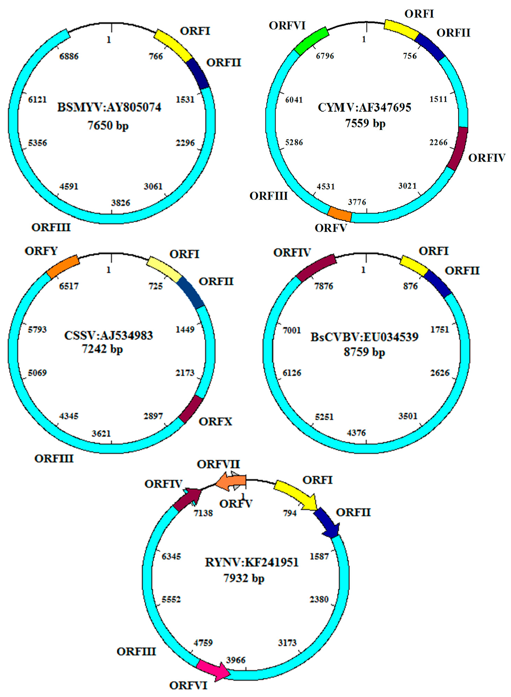 Genome organization of representative badnaviruses with varying number of open reading frames. BSMYV, Banana streak MY virus; BsCVBV, Bougainvillea spectabilis chlorotic vein banding virus; CSSV, Cacao swollen shoot virus; CYMV, Citrus yellow mosaic virus; RYNV, Rubus yellow net virus.