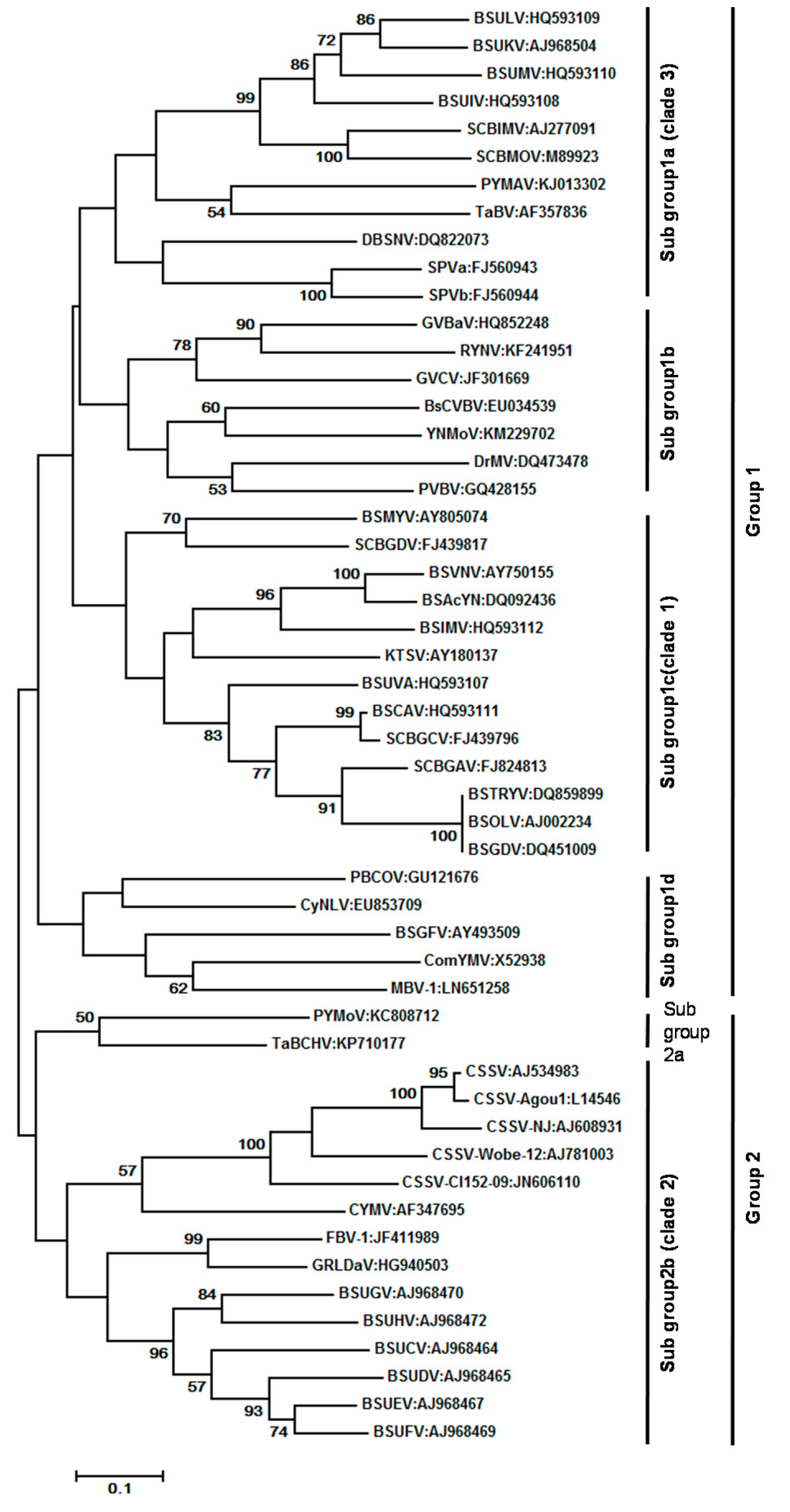 At present, 70 complete genome sequences representing 28 recognized species and 20 complete genome sequences representing 16 putative species are available in the GenBank database (Supplementary Materials Table S1). CSSV has the smallest (7006 bp) and BsCVBV the largest (8759 bp) genome among confirmed species. Maximum likelihood phylogeny of 52 badnavirus isolates representing different species based on the alignment of a 540-bp fragment of the RT/RNase H viral region is furnished in Figure 6. The evolutionary history was inferred by using the Maximum Likelihood method based on the Tamura-Nei model. Evolutionary analyses were conducted in MEGA7. Initial tree(s) for the heuristic search were obtained automatically by applying Neighbor-Join and BioNJ algorithms to a matrix of pair wise distances estimated using the Maximum Composite Likelihood (MCL) approach, and then selecting the topology with superior log likelihood value. The 52 badnavirus sequences clustered into two major groups and group 1 could be divided into: subgroup 1a, which contained all Banana streak virus (BSVs) and Sugarcane bacilliform virus (SCBVs) of clade 3 published [46]; and subgroup 1b, which consisted of Gooseberry vein banding associated virus (GVBaV), RYNV, Grapevine vein clearing virus (GVCV), BsCVBV, YNMoV, DrMV, and Pelargonium vein banding virus (PVBV). The subgroup 1c comprised all the BSV species of clade 1 as per [46]. In contrast to earlier studies, the ComYMV and Banana streak GF virus (BSGFV) were grouped together in subgroup 1d. The other members of subgroup 1c are Pineapple bacilliform CO virus (PBCOV), Mulberry badnavirus 1 (MBV-1), and Cycad necrotic leafspot virus (CyNLV). Group 2 was further divided into two subgroups. Sub-group 2a consisted of two species, viz. PYMoV and TaBCHV, and subgroup 2b consisted of members of BSVs, CSSV, and CYMV as reported in clade 2 of the previous study [46]. The other members of this subgroup were Fig badnavirus 1 (FBV-1) and GRLDaV.