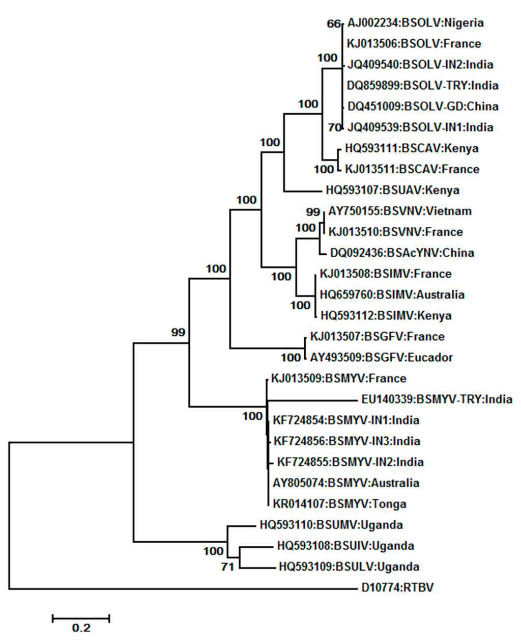 We constructed a phylogenetic tree using the maximum-likelihood method using the MEGA 5.0 software by aligning of amino acid sequences of ORF 3 from the 27 complete genome sequences of BSVs available in NCBI GenBank with RTBV as the outgroup member (Figure 7). Different isolates of some BSV species clustered together, although their geographic origins were different. Three of four distinct species from Uganda (BSUMV, BSUIV and BSULV) were clustered together, while a Kenyan isolate, BSUAV, was clustered along with BSCAV isolates. BSOLV isolates from India, China, France, and Nigeria clustered together, as did BSMYV isolates from India, Australia, France, and Tonga.