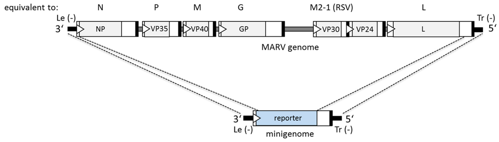The first MARV minigenome system was generated in the Mühlberger laboratory based on A. Ball’s vector p 2.0 in which the MARV minigenome sequence was inserted between the T7 RNA polymerase promoter and the HDV ribozyme [60,98]. To our knowledge, all subsequently generated MARV minigenomes follow a similar design [61]. The minimal requirement for replicating minigenomes is the possession of the replication promoters at both minigenome ends [60]. Transcribing minigenomes also need the transcription promoter located at the 3′ end of the minigenome (negative-sense orientation) and virus-specific GS and GE signals flanking each gene [60,66]. The viral genes are removed and replaced by one (monocistronic minigenomes) or more (polycistronic minigenomes) non-viral genes, usually reporter genes. Reporter gene expression is an easy readout for successful minigenome transcription and replication.