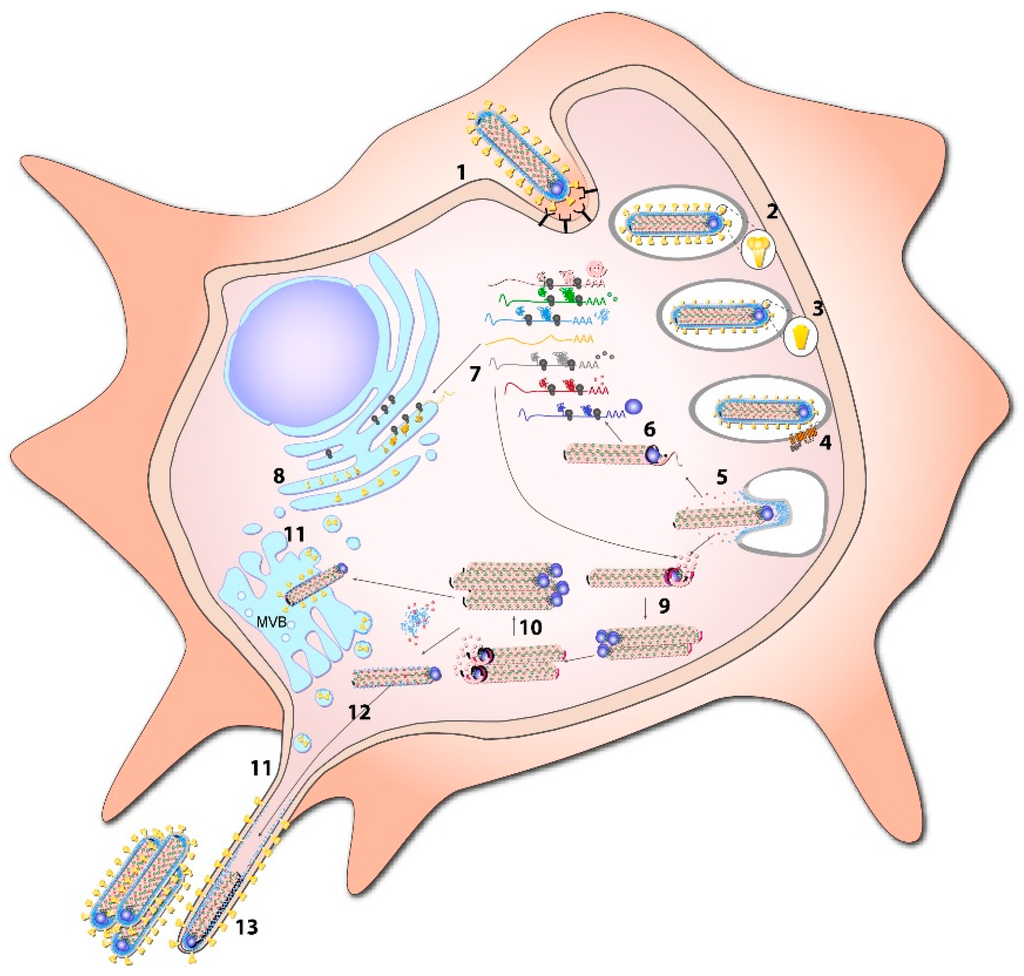 MARV replication cycle. MARV attaches to the surface of target cells by binding to attachment factors (1); following endocytosis (2); glycoprotein subunit GP1 is cleaved by endosomal proteases (3) facilitating binding to Niemann-Pick C1 (NPC1); the entry receptor (4); fusion is mediated in a pH-dependent manner by glycoprotein subunit GP2. Following release of viral nucleocapsid into the cytosol (5); transcription of the viral genome takes place (6); mRNA is subsequently translated by the host cell machinery (7); synthesis of GP takes place at the endoplasmic reticulum (ER) and undergoes multiple post-translational modifications on its way through the classical secretory pathway (8); positive sense antigenomes are synthesized from the incoming viral genomes (9); these intermediate products then serve as templates to replicate new negative-sense genomes (10); after cleavage in the Golgi, GP is transported to multivesicular bodies (MVB) and to the cell membrane where budding takes place preferentially from filopodia (11); nucleocapsids and viral protein (VP) 24 are also recruited to sites of viral budding (12); which is mainly driven by VP40 (13); figure and modified legend from [3].