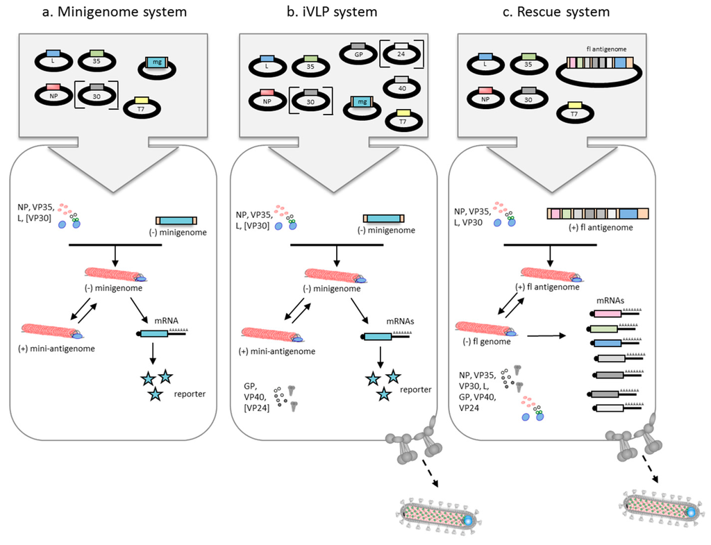 MARV reverse genetic systems. (a) Minigenome system; (b) infectious virus-like particles (iVLP) system; and (c) rescue system. In all systems, cells are transfected with the expression plasmids for the nucleocapsid proteins (NP, VP35, VP30, large protein (L)). For the iVLP system, the expression plasmids for GP, VP40 and VP24 are also included to facilitate budding. Viral proteins, which are not essential for the respective system, are bracketed. The T7 RNA polymerase (T7), which is required for the expression of the minigenome (mg), the full-length antigenome (fl antigenome) and, depending on the plasmid backbone, for the expression of the support proteins, can be provided by using T7-expressing cells, infection with T7-expressing viruses or by transfecting a T7 expression plasmid. (a,b) Minigenomic or (c) antigenomic cDNA is transcribed by T7 resulting in negative-sense minigenomic RNA or positive-sense fl antigenomic RNA. Encapsidation is mediated by the expressed viral nucleocapsid proteins. (a,b) The minigenome is replicated via a positive-sense mini-antigenome intermediate. Transcription of the minigenome leads to reporter gene expression; (c) The fl antigenome serves as the template for the production of viral genomic RNA which in turn is the template for viral mRNA as well as antigenome production. (b,c) In the iVLP and rescue systems, viral particles are released from the transfected cells. The iVLPs contain minigenome RNA, while the rescue system leads to the production of infectious MARV particles.