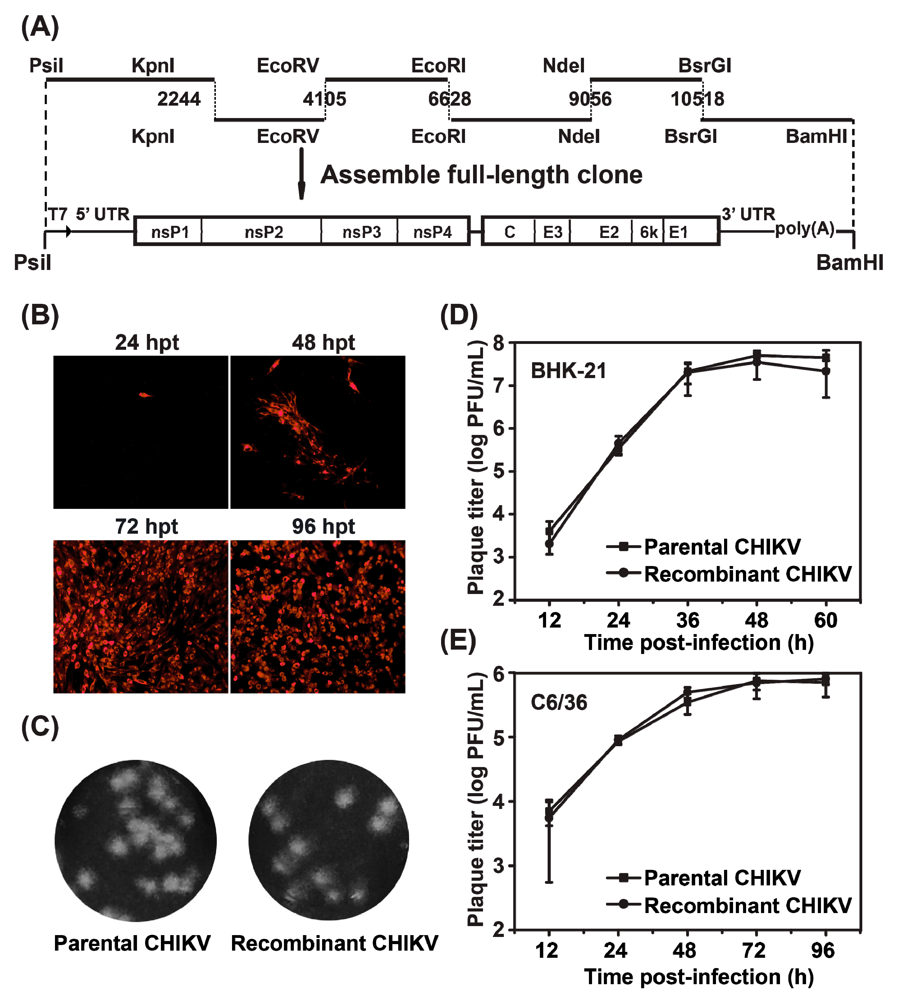 The full-length CHIKV cDNA clone, pACYC-CHIKV, was assembled with six subclones through distinct restriction cut sites as indicated in Figure 2A. A T7 promoter was engineered at the 5′-end of viral genome sequence for in vitro transcription. The recombinant CHIKV genomic RNA was in vitro transcribed from CHIKV cDNA clone, followed by linearization with BamHI. In vitro transcribed viral RNA was transfected into BHK-21 cells and IFA was firstly used to demonstrate viral replication by detecting viral E2 protein expression (Figure 2B). Increasing number of IFA-positive cells expressing viral E2 protein was observed from 24 to 96 hpt and almost 100% cells were IFA-positive at 72 and 96 hpt. Then, plaque morphologies were compared between the recombinant and parental viruses. As shown in Figure 2C, the plaque size of recombinant virus is similar to that of parental virus. Consistently, indistinguishable viral growth kinetics at MOI of 0.1 were observed between recombinant and parental viruses in either BHK-21 or C6/36 cells (Figure 2D,E). Overall, our data demonstrated that CHIKV infectious clone was constructed successfully and recombinant virus was infectious in both mosquito and mammalian cells. The recombinant CHIKV derived from infectious clone is designated as WT CHIKV in this paper.