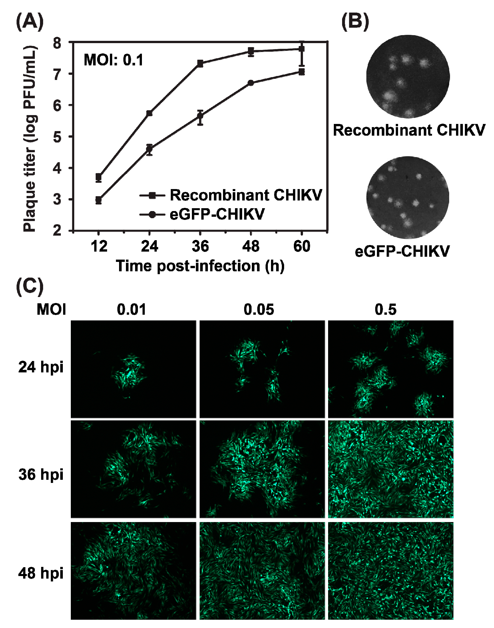 Characterization of eGFP-CHIKV reporter viruses. (a) comparison of the growth kinetics of recombinant WT CHIKV and eGFP-CHIKV in BHK-21 cells. The representative data were presented from three independent experiments; (b) plaque morphology of recombinant WT CHIKV and eGFP-CHIKV on BHK-21 cells; and (c) correlation between eGFP expression and different MOIs infection. BHK-21 cells were infected with eGFP-CHIKV at the indicated MOI and eGFP expression were observed at 24, 36 and 48 hpi.