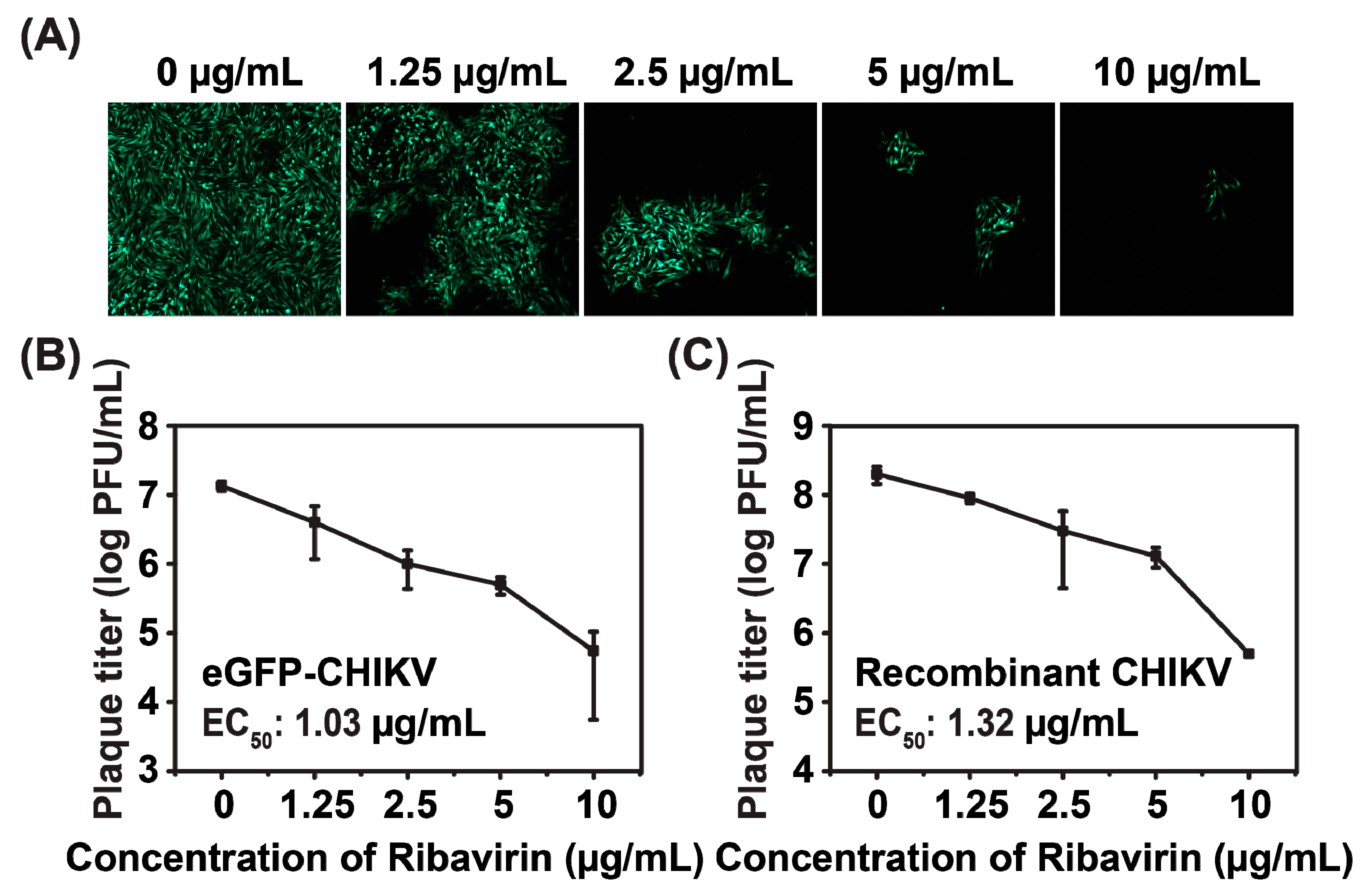 It has been demonstrated that ribavirin could inhibit CHIKV replication [26,27]. To further confirm the correlation between eGFP expression and viral replication, we assessed the antiviral activity of ribavirin using eGFP-CHIKV reporter virus. The eGFP expression levels and virus titers were determined at different concentrations of ribavirin that did not cause significant cytotoxic effects. The maximum concentration of ribavirin was 10 μg/mL and 2-fold serial dilutions were used in this study. The eGFP expressions of infected cells were reduced in a dose-dependent manner (Figure 5A), which was consistent with the reduction of viral titers (Figure 5B). Furthermore, the EC50 of ribavirin for eGFP-CHIKV was 1.03 μg/mL (4.22 μM), which was similar to that of WT CHIKV, i.e., EC50 = 1.32 μg/mL (5.41 μM) (Figure 5C). The results further confirmed that eGFP expression could be used to surrogate the replication of WT CHIKV. In addition, it was also suggested that the eGFP-CHIKV reporter virus system could be used for screening potential anti-CHIKV inhibitors.