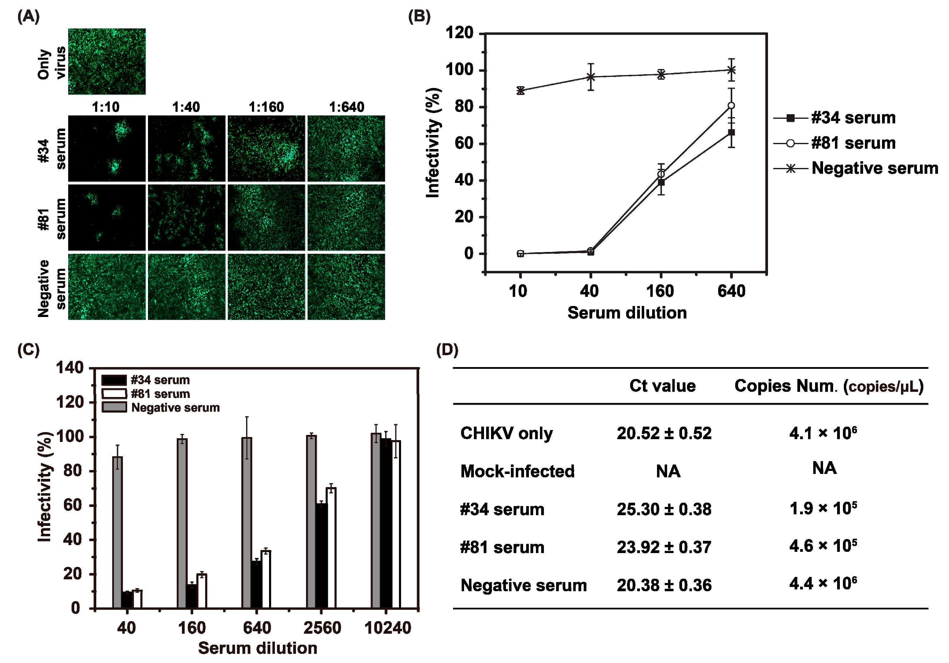 Confirmation of the availability of eGFP-CHIKV in neutralization assay with the serum samples from CHIKV-infected patients. (a) detection of eGFP expression by fluorescent microscope with different dilutions of human sera. The neutralization assay was performed in a 12-well plate. Serially 4-fold diluted human sera were incubated with eGFP-CHIKV at an MOI of 0.05 for 1 h at 37 °C before adding the mixture to the monolayer of BHK-21 cells in the 24-well plates. The readout of eGFP expression was recorded at 48 hpi. The serum from health person was used as a negative control; (b) quantification of neutralization assay with increasing serum dilution. The percentage inhibition of infectivity was normalized to eGFP-CHIKV infection without serum incubation by quantification of eGFP expression levels; (c) neutralizing activity of the human sera against WT CHIKV based on PRNT assay. WT CHIKV was incubated with 4-fold dilutions of individual sera before infecting BHK-21 cells. The percentage inhibition of infectivity for each dilution was normalized to WT CHIKV infection alone by counting the number of plaque forming units (PFU); (d) detection of CHIKV genome copy number in BHK-21 cells treated with virus or virus-antiserum mixture by real-time RT-PCR. The results are positive if Ct value ≤34, otherwise negative if Ct value >34. The genome copy numbers of #34 and #81 were significantly decreased than those of control samples (t-test, p < 0.05). CHIKV only = BHK-21 cells were infected by WT CHIKV without serum incubation; mock-infected = BHK-21 cells were neither infected by WT CHIKV nor incubated with serum; NA = data not available. All experiments were performed in triplicate, and the representative data were presented.
