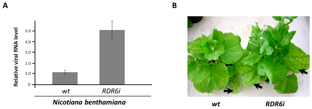 - Qin, C.; Shi, N.; Gu, M.; Zhang, H.; Li, B.; Shen, J.; Mohammed, A.; Ryabov, E.; Li, C.; Wang, H.; Liu, Y.; Osman, T.; Vatish, M.; Hong, T. Involvement of RDR6 in short-range intercellular RNA silencing in Nicotiana benthamiana. Sci. Rep. 2012, 2, 1–6. [Google Scholar] [CrossRef] [PubMed]