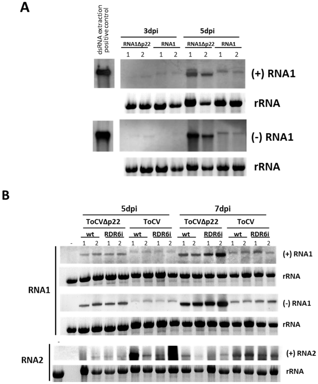 Northern blot analysis using digoxigenin (DIG)-labelled RNA probes to detect the positive (+) or negative (−) sense RNA forms during local infection with wild-type or p22 mutant Tomato chlorosis virus (ToCV) (ToCV and ToCVΔp22, respectively). (A) Local RNA1 replication and accumulation of (+) and (−) sense strands [(+) RNA1 and (−) RNA1] at 3 and 5 dpi in patches of wild-type Nicotiana benthamiana agroinfiltrated with RNA1 infectious clones of ToCV or ToCVΔp22. As a positive control, a dsRNA extraction from a ToCV infected plant was used; (B) Local replication and accumulation of (+) and (−) sense strands [(+) RNA1 and (−) RNA1] of RNA1, and accumulation of (+) strand [(+) RNA2] of RNA2 at 5 and 7 dpi in patches of wild-type and RDR6i N. benthamiana plants agroinfiltrated with infectious clones of RNA1 of ToCV or ToCVΔp22 and RNA 2 of ToCV. Samples from two independent plants (1,2) were analysed. Ethidium bromide-stained rRNA was used as loading control.