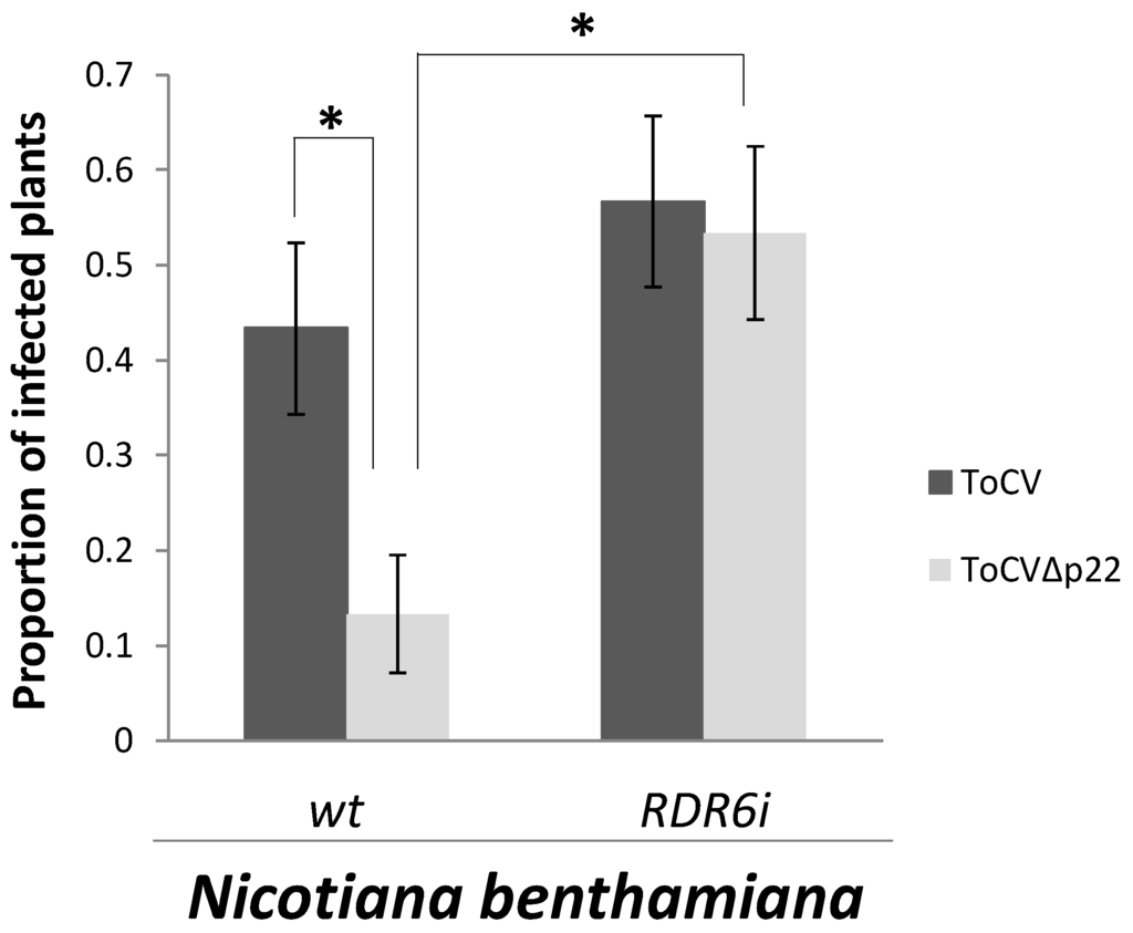 Understanding the underlying mechanisms in plant virus confrontations is a prerequisite for control of viral diseases. In this work, we demonstrate that RDR6 plays an antiviral role in plant defence against ToCV. Additionally, by using a p22-deficient ToCV infectious mutant clone (ToCVΔp22), we investigated the specific role of this protein in the viral infection process in both wild-type and RDR6-silenced N. benthamiana plants.