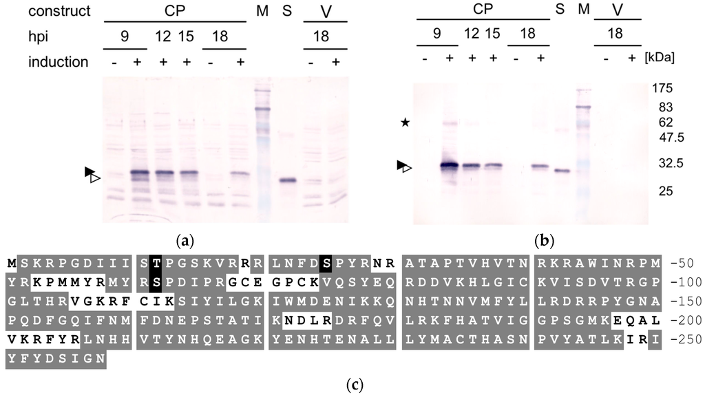 The successful expression of ACMV CP in fission yeast extends the list of several geminiviral proteins that were produced in this organism [35,36,46,47,48,49]. S. pombe is a more suitable model organism than Saccharomyces cerevisiae and bacteria because its molecular mechanisms are more closely related to those of plants concerning post-translational modifications, chromatin structure, and RNA processing [50,51,52,53,54,55]. In particular, the nuclear environment for CP targeting was thought to be the proper compartment to mimic the situation during plant infection [28]. Since CP was expected to bind sequence-unspecifically to DNA [21,22,23,24], which could interfere with cell division, an inducible promoter allowed a regulated expression to minimize deleterious effects. However, later during cell culture (18–20 hpi), non-expressing cells tend to overgrow the expressing cells leading to lower relative yields of protein. The optimized expression protocol yielded best results at 9 hpi in a broad series of experiments. In contrast to bacterial expression, which leads to inclusion body formation, substantial amounts remained in the supernatant after low-speed centrifugation of cell extracts in fission yeast (Figure 1) and remained in a free state during isopycnic centrifugation (Figure 2). The corresponding lack of the necessity to renaturate the target proteins is likely the most important advantage.
