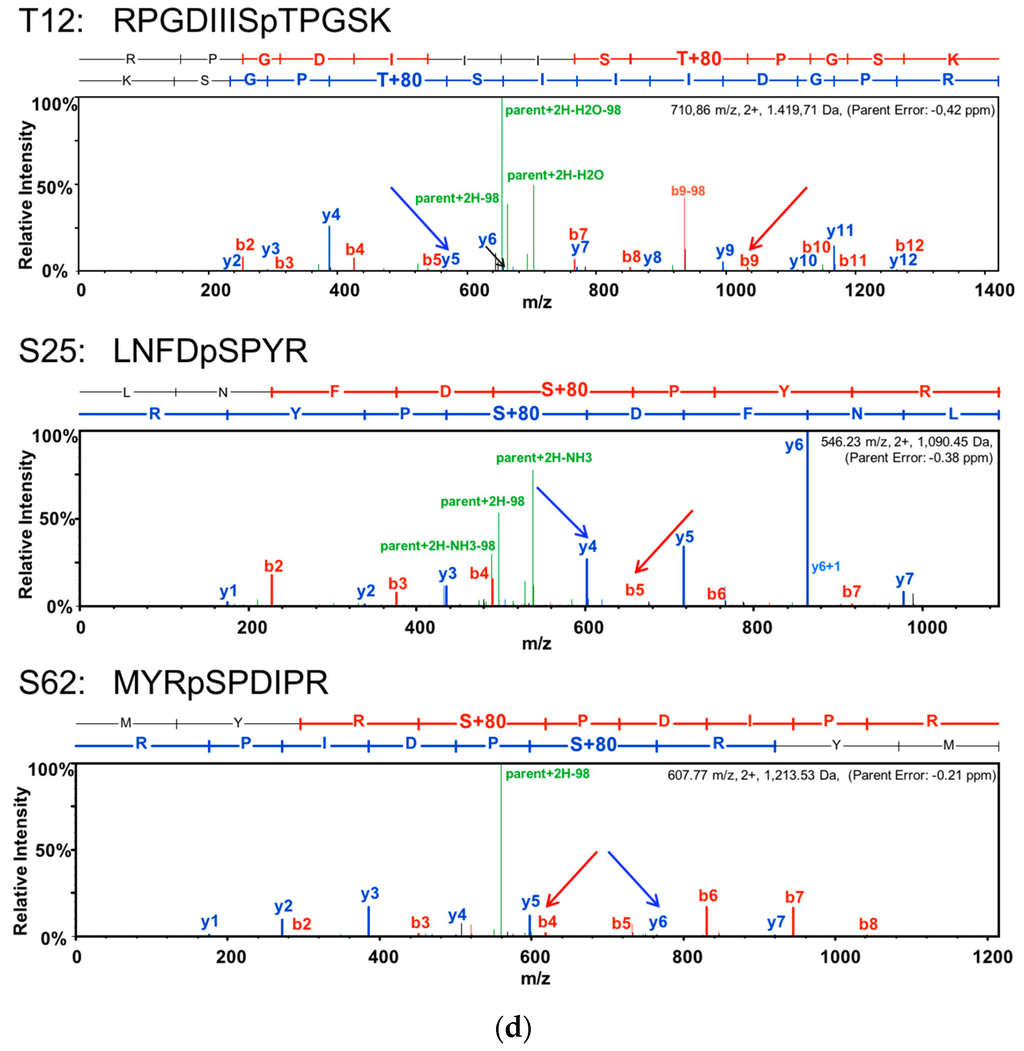 A major upper yCP band (Figure 1a,b; filled arrowhead) migrated not as far as pCP (Figure 1a,b; S; open arrowhead). Only considerably fainter bands with higher mobility could be detected for yCP (Figure 1a,b; open arrowhead). The difference in mobility may be caused either by a yeast-specific or a plant-specific modification of the CP. To scrutinize this question, mass spectrometry was employed to examine possible modifications. Tryptic peptides from the gel-purified yCP band from the pellet fraction showed a coverage of 85% for the predicted amino acid sequence inferred from the DNA sequence (AJ427910 of ACMV-NG with a T55M exchange determined by sequencing of the clone used, Figure 1c). A fragment without initiator methionine and serine at the start position indicated that yCP was processed (Figure 1c). Furthermore, T12, S25, and S62 were found to be phosphorylated (Figure 1c,d). These phosphorylation sites were verified by the fragmentation spectra (Figure 1d), whereas fragments with other predicted phosphorylation sites (Y57, Y205) were not resolved.