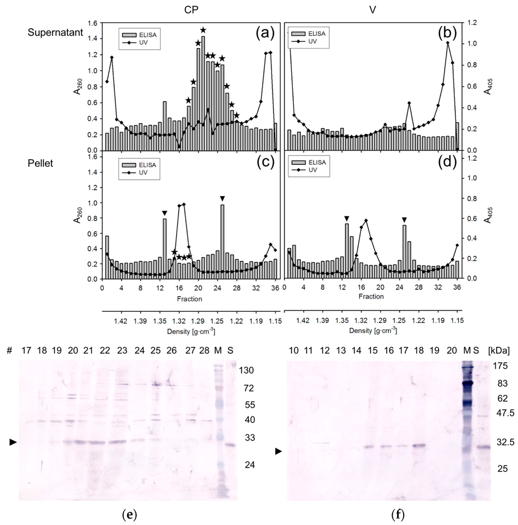 Cs2SO4 (35% w/v final concentration) was added to supernatant or pellet fractions of the cell extracts from 10 mL cultures. After a pre-centrifugation (20 min, 16,340× g, 4 °C; Sorvall RC 5C, Hb6 rotor) for the pellet fraction, in order to remove insoluble material, both supernatants were used for the isopycnic gradient centrifugation (17 h, 50,000 rpm, 4 °C, Beckman L7-65, VTi65.1 rotor). Fractions from the bottom of the tube in 350 to 400 µL-aliquots were analyzed by UV-absorption, enzyme-linked immunosorbent assay (ELISA), Western blotting, and refractometry (Zeiss, Oberkochen, Germany). For SDS-PAGE, 100 µL aliquots were precipitated by adding 20 µL 1 mg·mL−1 yeast RNA (Roche Applied Sciences, Mannheim, Germany), 1/10 vol. 3 M Na-acetate pH 4.8 and 2 vol. ethanol, and washed twice with 70% ethanol and resuspended in 20 µL water, a quarter of which was applied per lane.