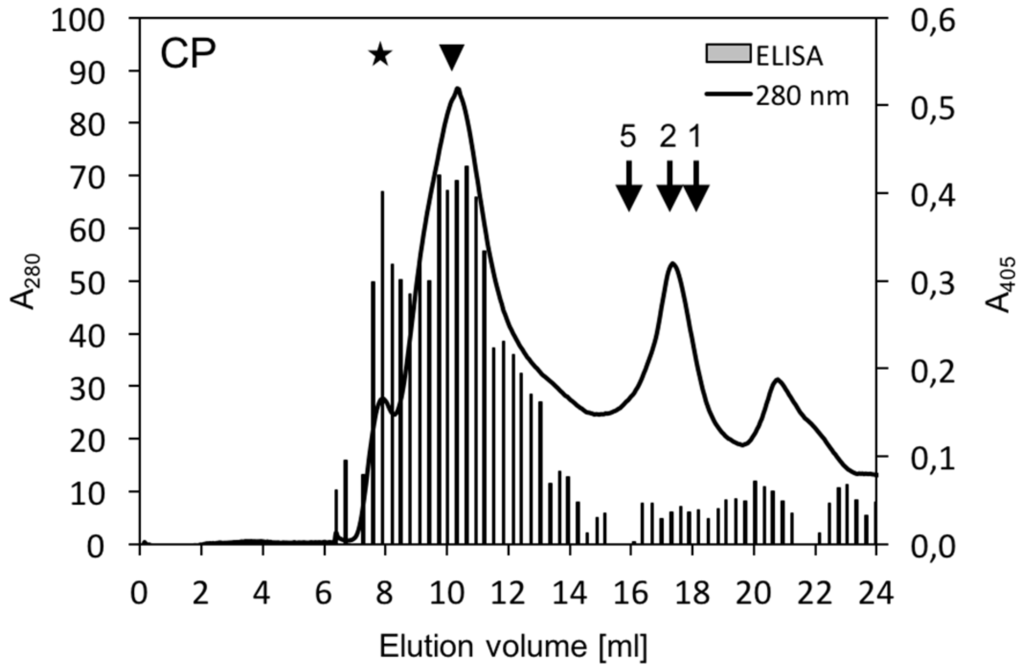 In order to determine the oligomerization state, size-exclusion chromatography of supernatant yCP was employed. In initial experiments using Superdex 200 columns, yCP eluted mainly in the void volume. Therefore, columns with larger pore size (Superose 6 HR 10/30) were used further on, with 0.6–0.7 M NaCl in the elution buffer to reduce DNA-binding (Figure 3). Most of the yCP eluted at volumes corresponding to high molecular masses of 2.8–6.7 MDa as well as in the void volume, (Figure 3, arrowhead and asterisk, respectively). Electron microscopic examination of various yCP positive fractions did not reveal any regular structure resembling geminate particles.