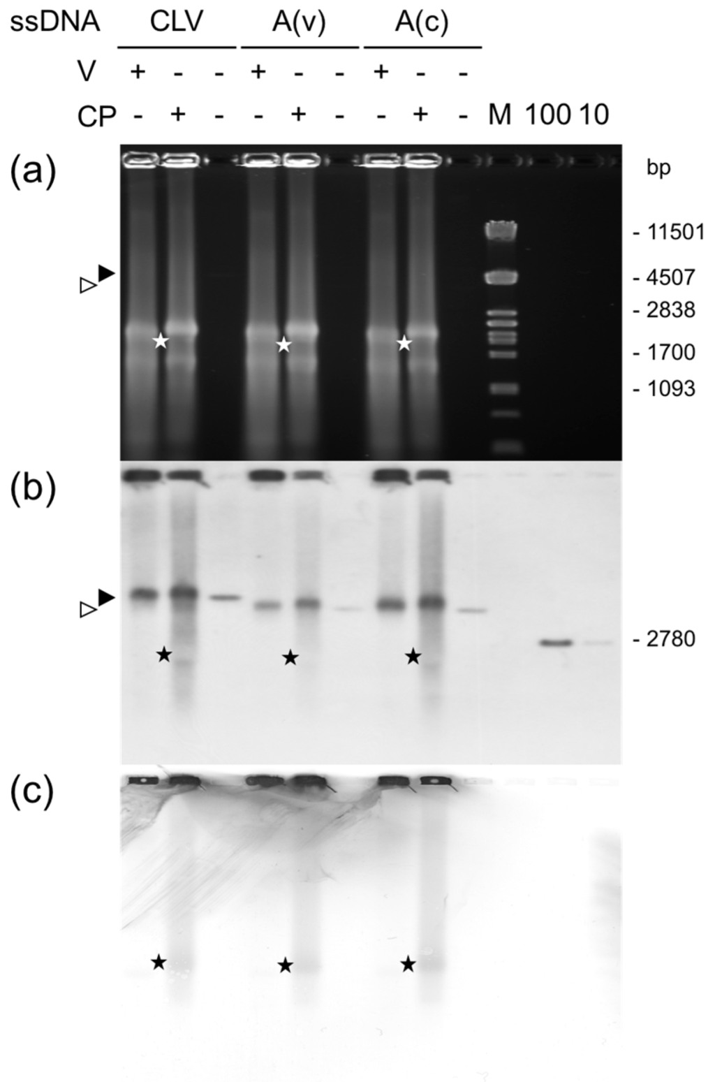 Interaction of CP with ssDNA. Extract supernatants from CP-expressing (CP) or control cells (V) were incubated with ssDNA from pCLV1.3A (CLV), pBlue:ACMVA(v) (A(v)), or pBlue:ACMVA(c) (A(c)). Complexes or ssDNA alone were precipitated with polyethylene glycol and analyzed on an ethidium bromide stained 0.7% agarose gel (a) or, after blotting onto nylon (b) or nitrocellulose (c) membranes, for viral DNA or CP detection using hybridization with an ACMV DNA A-specific probe (b) or an CP-specific antibody (c), respectively. The corresponding positions of complexes with ssDNA and CP are indicated by asterisks, the positions of ssDNA by arrowheads. M: PstI fragments of λ DNA with bp indicated. Hybridization standards: 100 and 10 pg of linearized full-length ACMV DNA A (10, 100). Bands in (a): rRNA.
