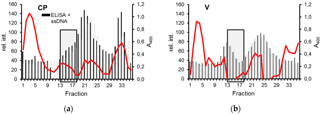 Separation of CP and ssDNA by density gradient centrifugation. Extract pellets either from CP-expressing (a) or control cells (b) were incubated with ((+)ssDNA) or without ((−)ssDNA) pBlue:CR250 ssDNA, and analyzed in Cs2SO4 gradients by ELISA for CP as described in Figure 2 and by dot blot hybridization for DNA. Relative hybridization signal intensities (rel. int., red lines) are shown after background subtraction on the left y axis, ELISA values on the right axis. Fractions with relevant differences are boxed.