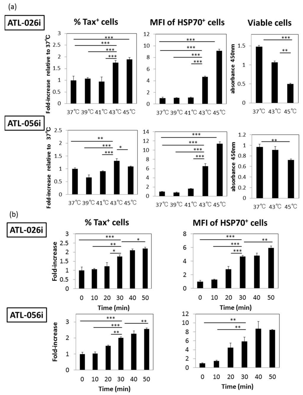 Effects of heat shock (HS) exposure on human T cell leukemia virus type-I (HTLV-I)-infected cell lines derived from acute adult T cell leukemia (ATL) patients: (a) Aliquots of ATL-026i and ATL-056i cells were incubated at various temperatures for 30 min and cultured for 24 h. The cells were then analyzed for the frequencies of trans-activator (Tax)+ cells (left bar graphs) by flow cytometry (FCM) and the relative density (Mean Fluorescent Intensity, MFI) of heat shock protein 70 (HSP70) expression (middle bar graphs) and for cell viability using the CCK-8 cell counting kit (right bar graphs). (b) The kinetics of the up-regulation of Tax and HSP70 expression by the same two cell lines following exposure to 43 °C for various times is shown. The values denote the means ± SD. * p < 0.05, ** p < 0.01, *** p < 0.001.