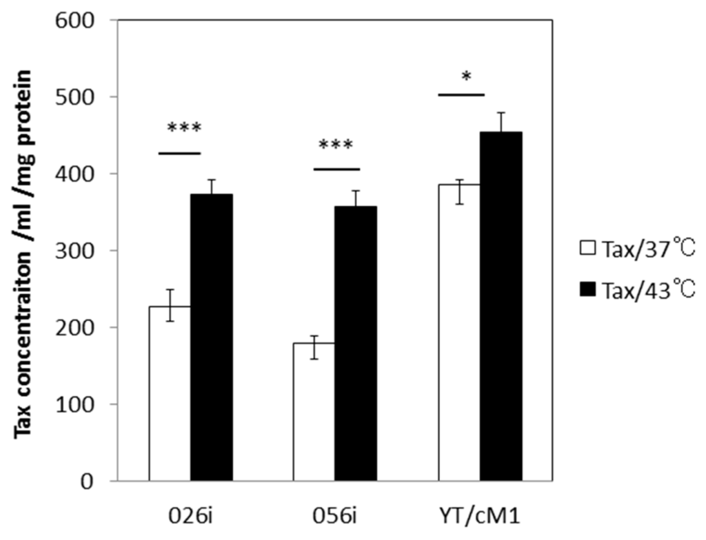 Effect of HS on total Tax protein expression: Aliquots of the ATL-derived cell lines (ATL-026i and ATL-056i) and the HTLV-I-immortalized CD4+ T cell line (YT/cM1) were incubated at either 37 °C or 43 °C for 30 min followed by incubation for 24 h in triplicates wells. The cells were then collected, washed, lysed in lysis buffer and the total protein concentrations were determined. Then amounts of total Tax concentration/mg total protein were quantitated using our Tax specific enzyme-linked immunosorbent assay ELISA. The values denote the means ± SD. * p < 0.05, *** p < 0.001.