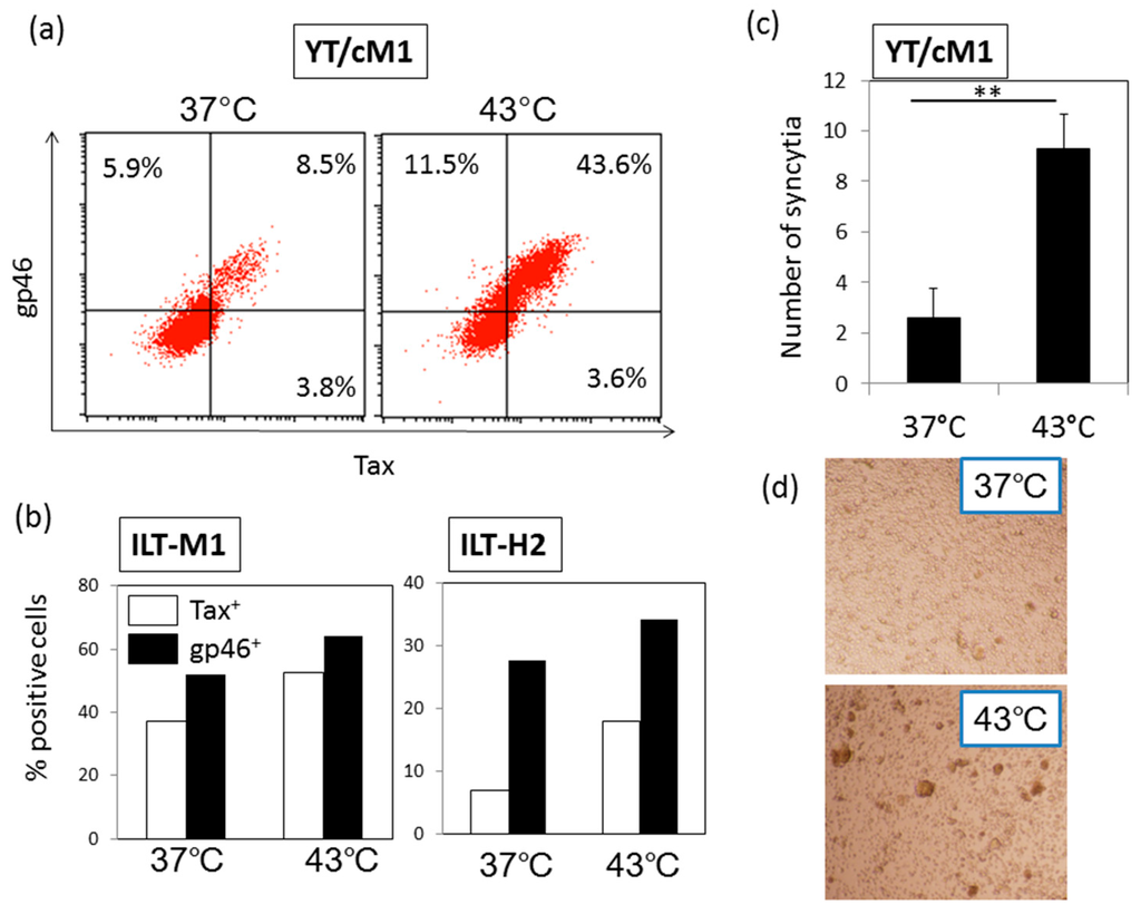 Next, we examined whether exposure to HS influences the expression of the HTLV-I structural envelope protein gp46 whose expression is known to be enhanced by Tax-mediated transactivation. As shown in Figure 3a, b, the up-regulation of gp46 antigen expression was apparent in three HTLV-I-infected T cell lines including the CD4+ and CD8+ T cell line (ILT-M1). In Figure 3a, it was obvious that gp46+ Tax− cells also increased after HS. We speculate that the gp46 on Tax-negative cells may represent biofilm of HTLV-I particles produced from Tax-positive cells, or alternatively, gp46+ Tax− cells may be at a resting phase after a productive infection phase. It is noteworthy that syncytium-forming capacity which is an indicator of HTLV-I infectivity, was enhanced significantly by the exposure of YT/cM1 cells to HS (Figure 3c and Figure 3d), indicating that HS also enhanced the functional form of gp46 expression. In addition, production of gag p24 in the culture supernatant of YT/cM1 cells was also enhanced by HS (Supplemental Figure S3).