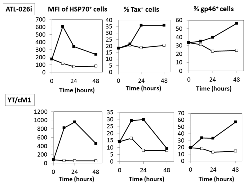 A comparison of time course of the expression among HSP70, Tax and gp46 antigens followed by exposure to HS: The ATL-026i (upper panel) and YT/cM1 (lower panel) cells were either exposed to HS (black square) or mock treated (open square), cultured for 12, 24 and 48 h, and then their phenotypes were analyzed by FCM. Data shown are representative of three independent experiments.