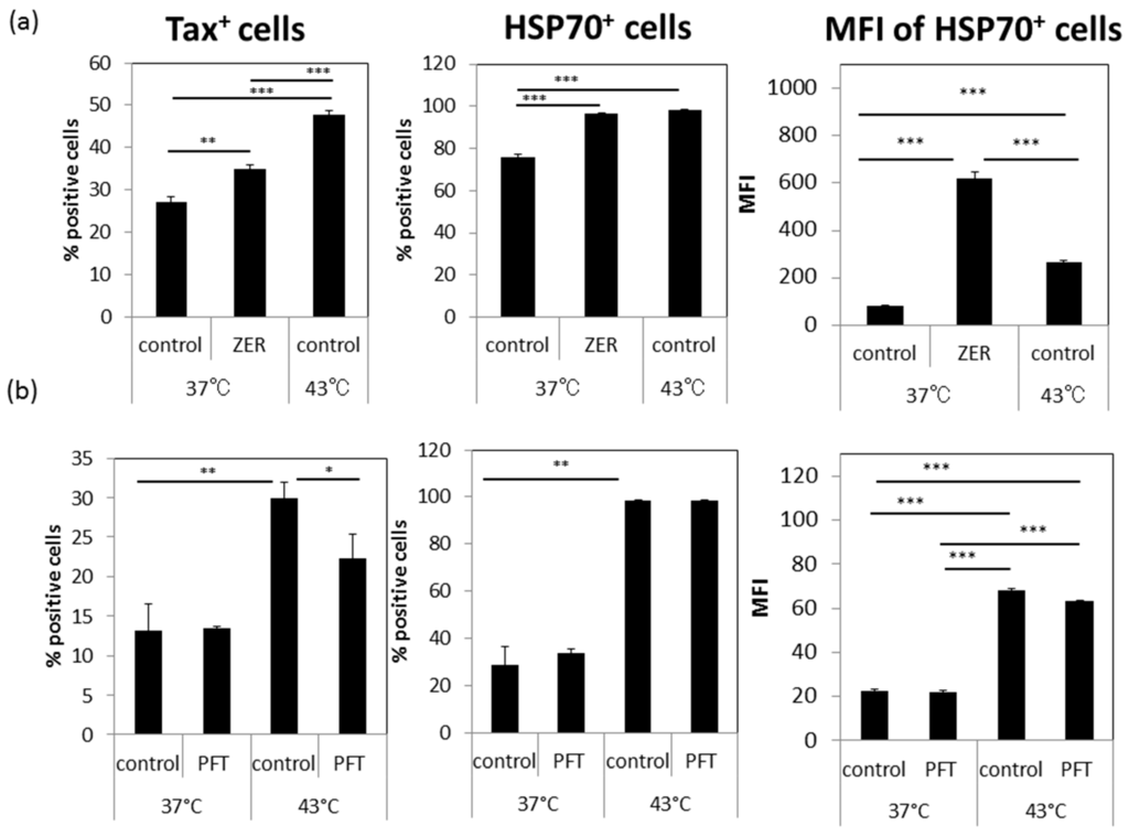 The effects of the HSP70 inducing and inhibiting agents on the expression of Tax antigen: Triplicate cultures of YT/cM1 cells were either exposed to HS or mock treated, and then cultured in the presence or absence of either (a) 10 μM zerumbone (ZER, HSP70 inducer) or (b) 1 μM pifithlin-μ (PFT, HSP70 functional inhibitor) for 24 h. The Tax and HSP70 expression was analyzed by FCM. The values denote the means ± SD. * p < 0.05, ** p < 0.01, *** p < 0.001.